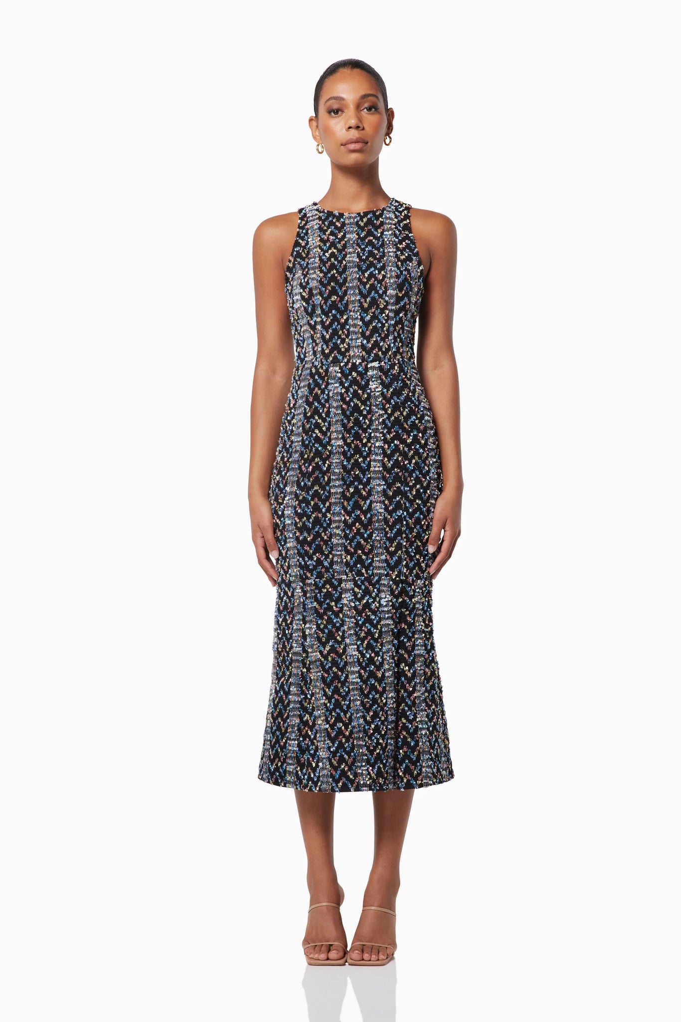 The Ada Dress is made from a stylish yet comfortable stretch tweed fabrication. This fit and flare style complemented with a demure high neckline, front split and fitted waist makes this the perfect number for spring racing and other luncheons and events.