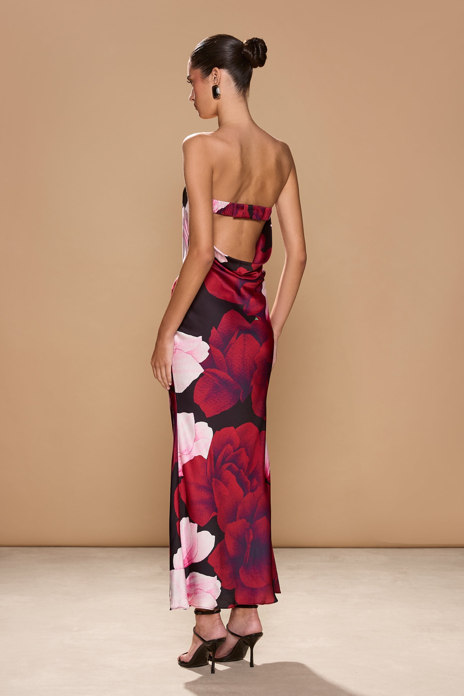 Designed with effortless sophistication, the Alma Dress embraces a chic and contemporary style. Featuring a scooped back with a cascading cowl design, the elastic back band adds a playful bow detail to this strapless midi length dress.