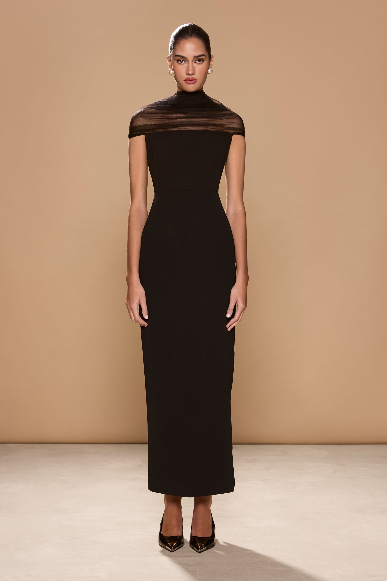 The Calido combines modern sophistication with timeless charm. Featuring a column silhouette and a tulle contrasting neck detail, this midi-length dress is fully lined for a flawless fit, with cap sleeves adding a touch of elegance.