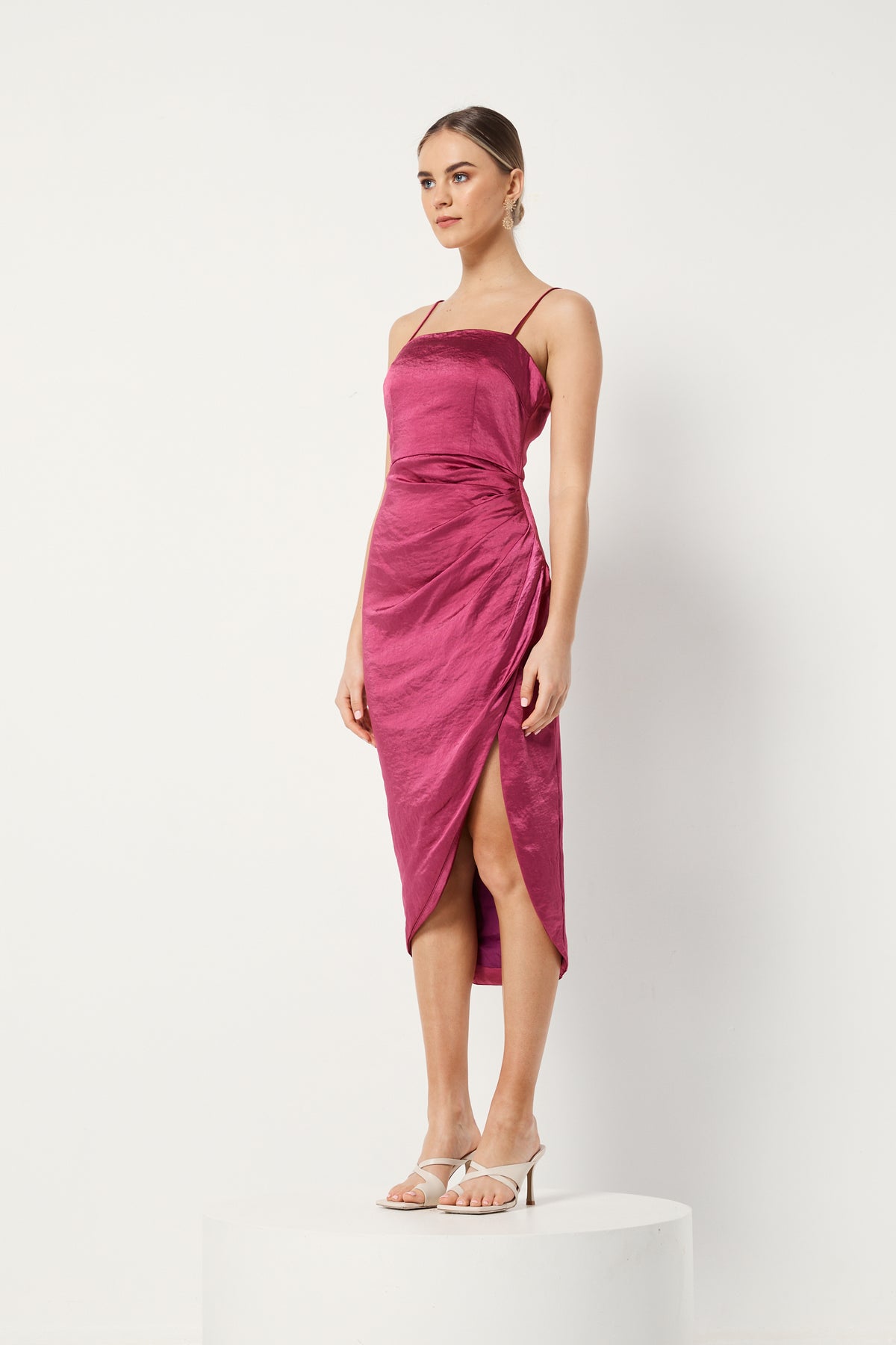 Satin fabric. High slit asymmetrical skirt. Hidden back zipper closure.