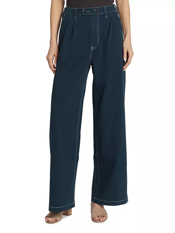 Monrow's pleated trousers are crafted of cotton twill. This four-pocket style showcases a high-rise waist, streamlined wide legs, and contrast top-stitching.