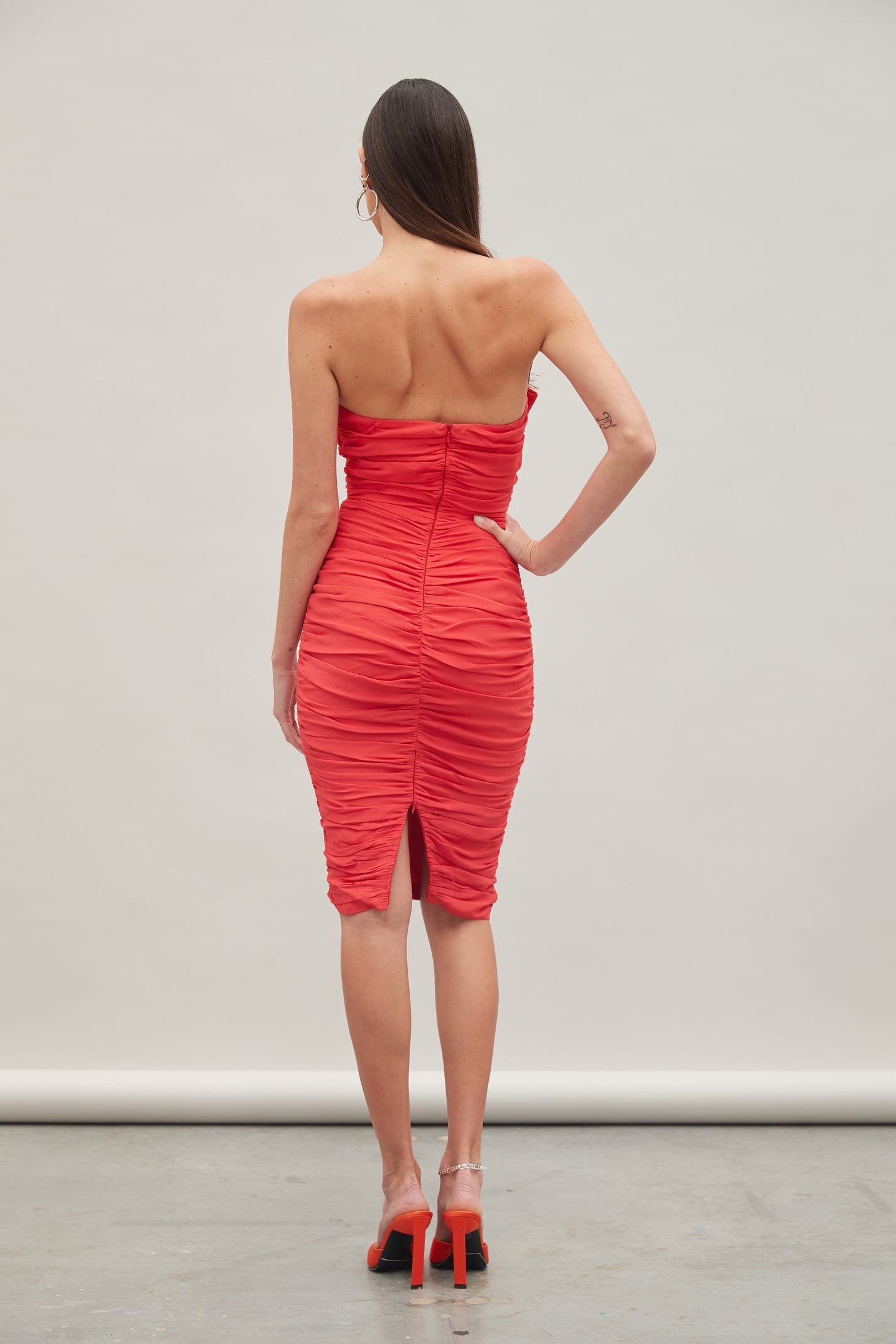 Strapless midi dress with ruched detailing and a plunge neckline.