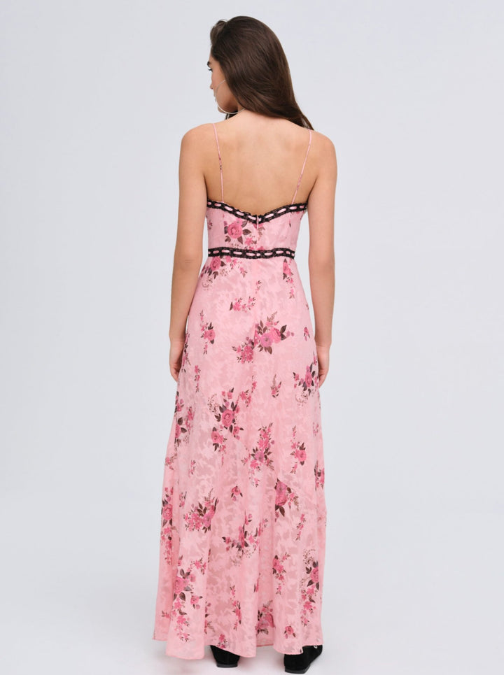 Embrace your romantic side with the Guinevere pink maxi dress, featured in a charming floral print. Showcasing a sweetheart ruffled neckline trimmed in slotted lace with ribbon and a lace-trimmed waist, this long floral dress is fit for every occasion, both day and night.