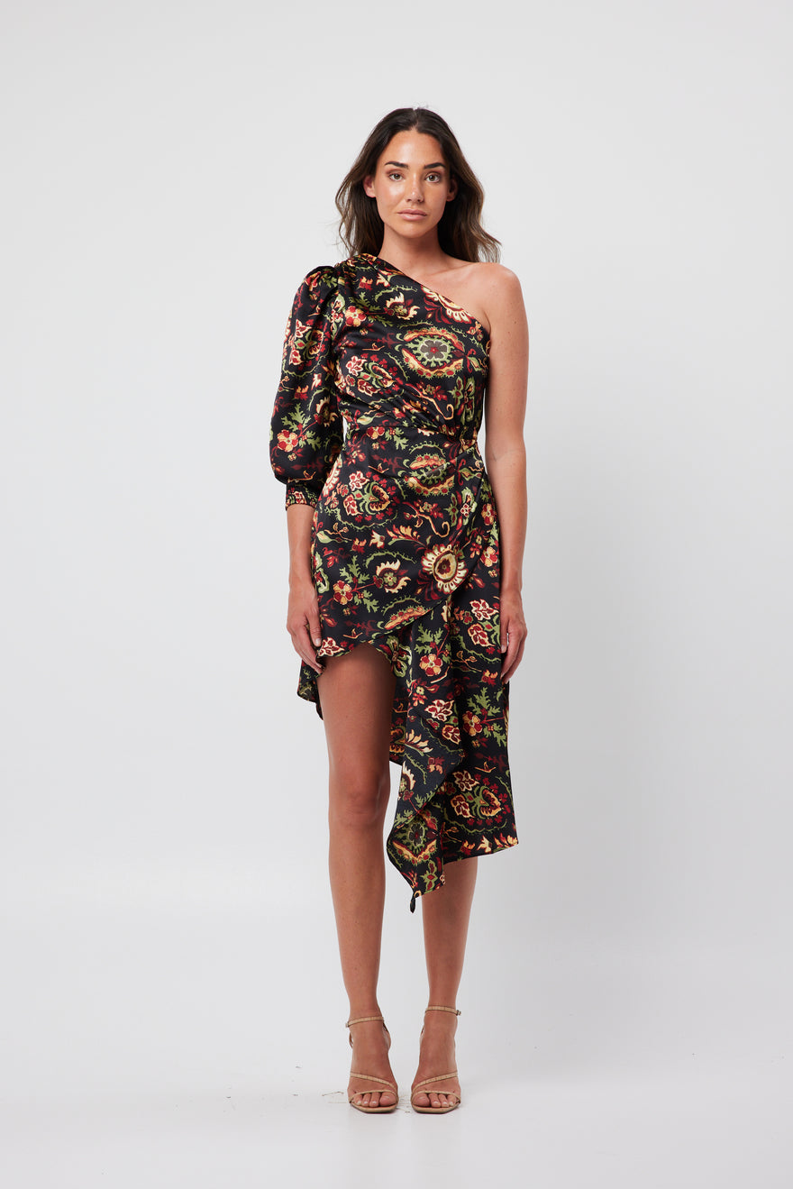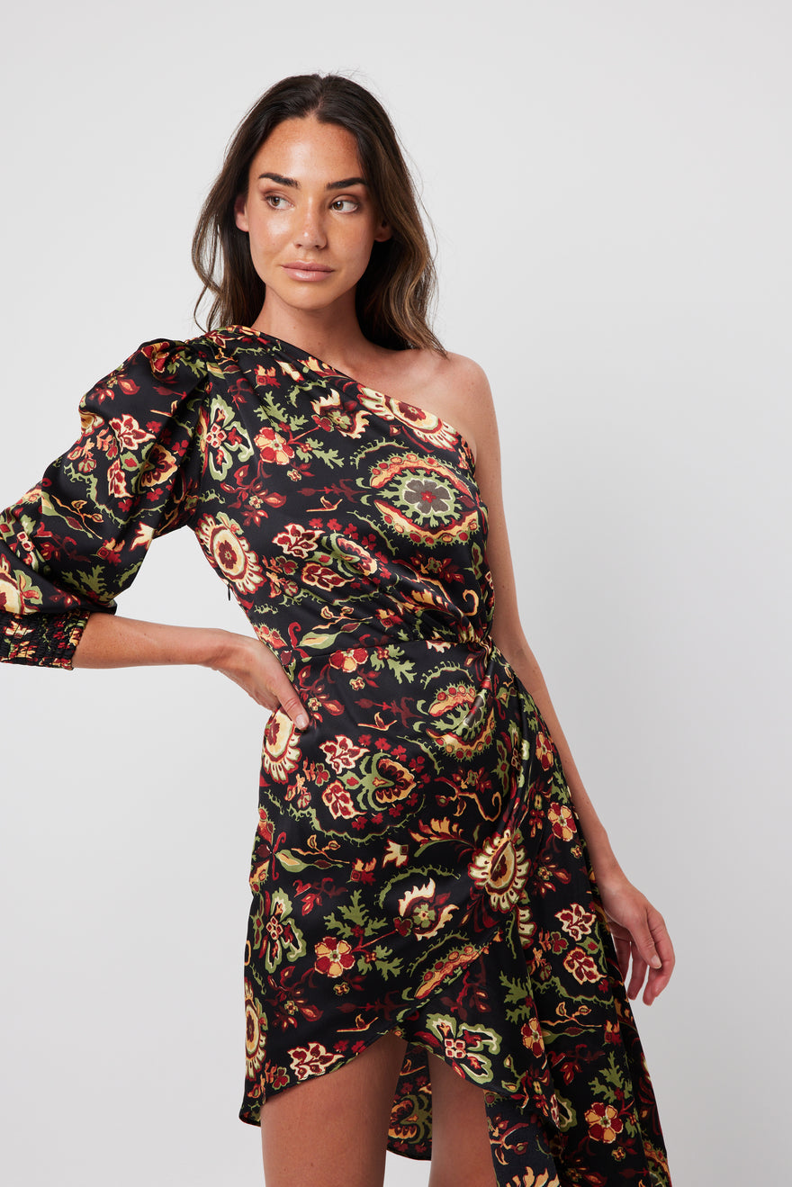 One-shoulder floral printed dress with asymmetrical hem.