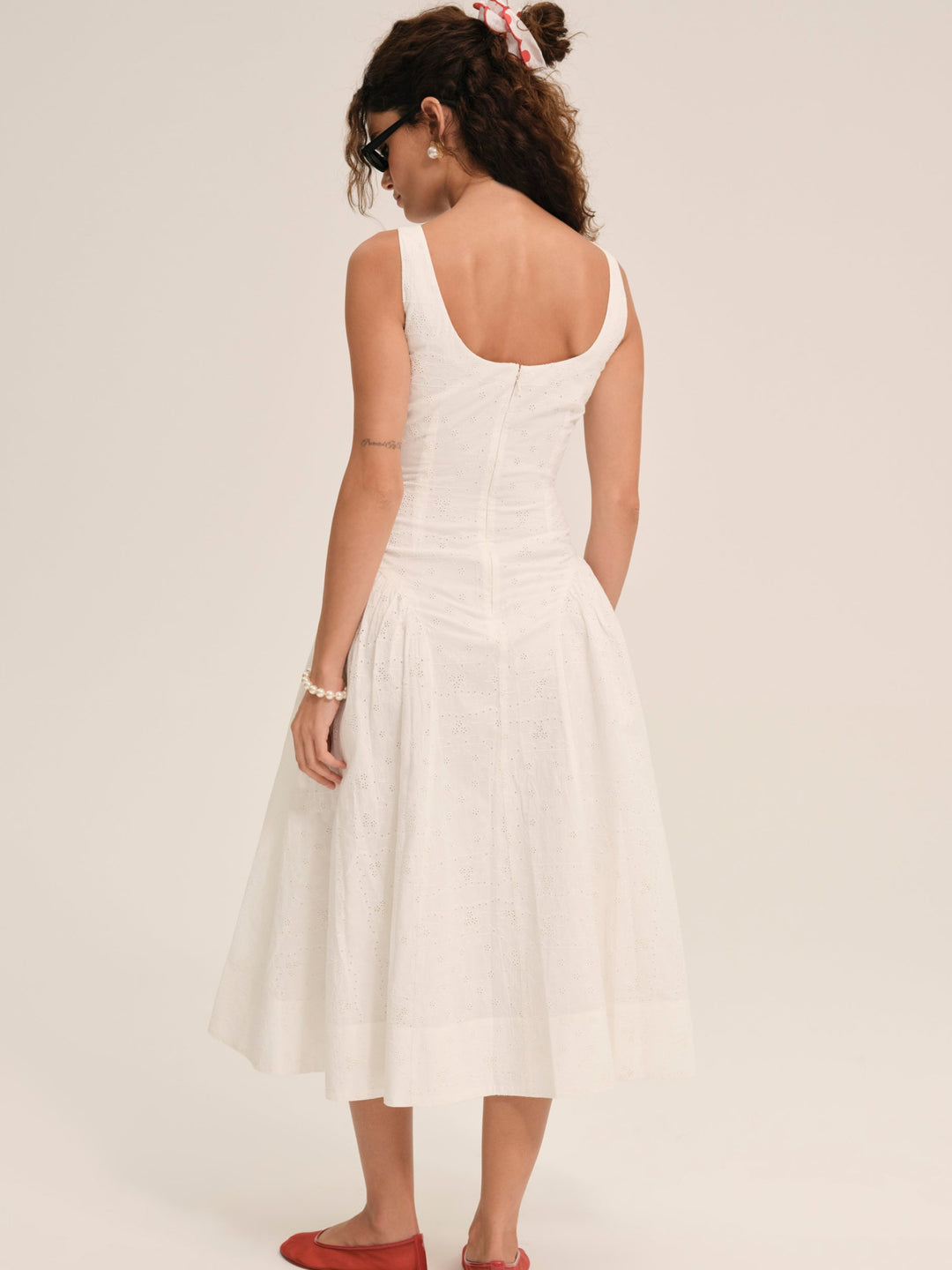 A timeless white dress for summer—the Handkerchief Midi Dress is crafted in a beautiful cotton eyelet. It features a '50s-inspired high neck, a drop waist, and simple bow detail at the center-front.
