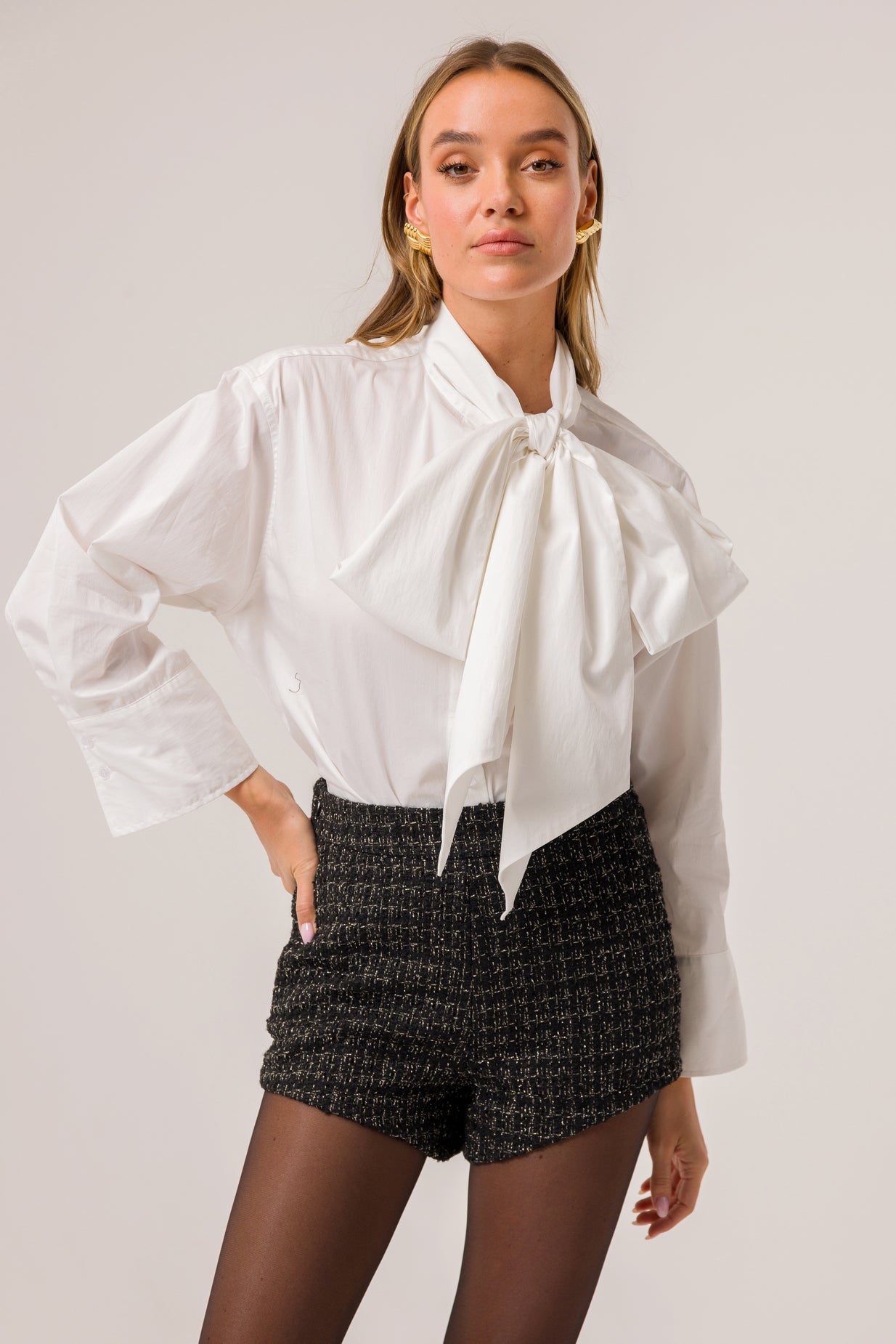 Elegant button-up blouse featuring a sophisticated bow tie detail at the neckline. The Kinny Top combines professional styling with feminine accents for versatile wardrobe integration.