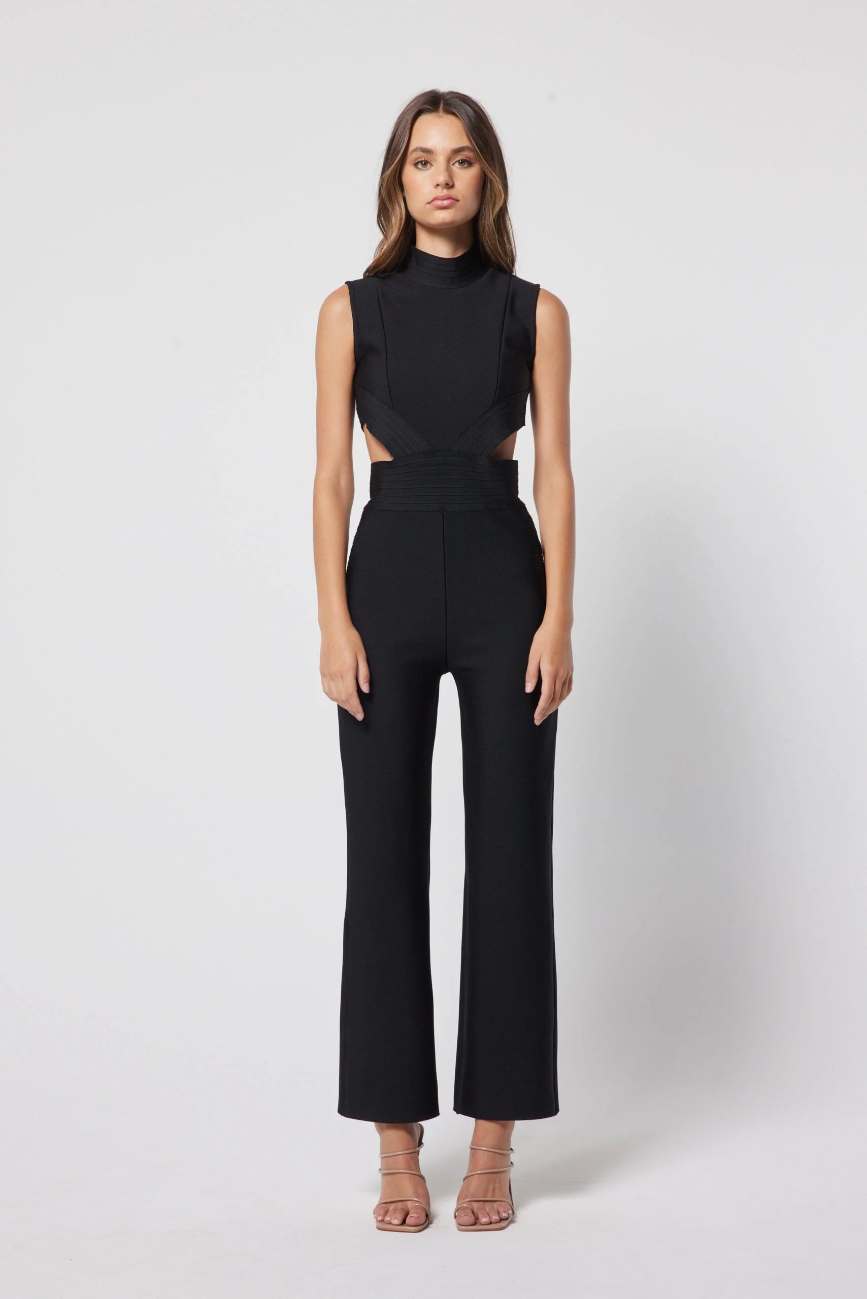 Featuring high neck, sleeveless design and cutouts, it’s balanced with a straight leg, making this a classy yet edgy choice.
