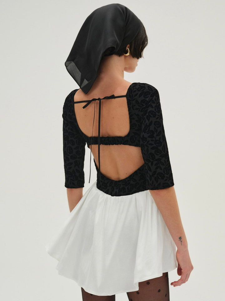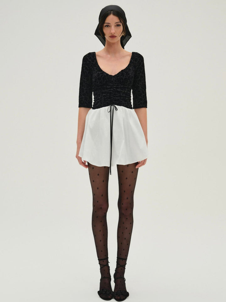 The Midnight black mini dress is a winter wardrobe staple with its luxe black velvet bodice, contrast white taffeta skirt and wide open neckline. Ruched underwire cups add structure, making it the perfect little black dress for a dinner party or dressing up for the joy of it.