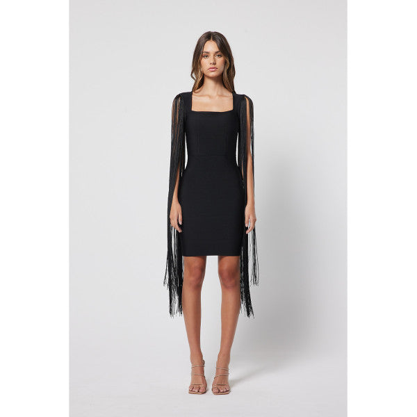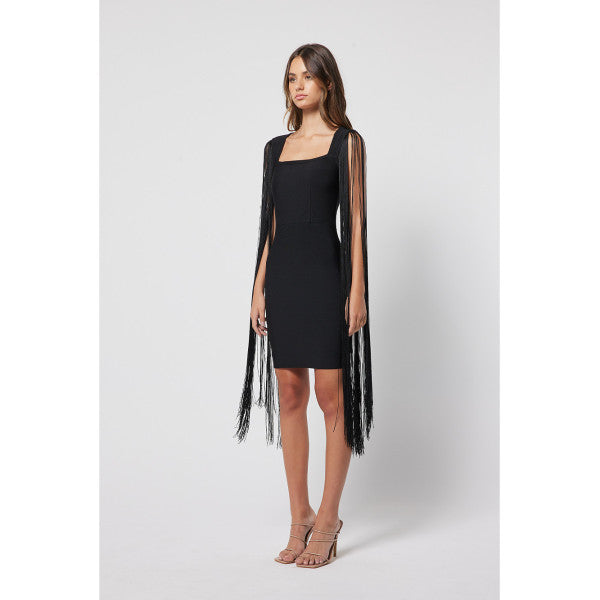 The Quelux Dress is an eye-catching choice for your next party. Crafted from black crepe and cut to a slim silhouette, it is finished with sweeping arm tassels that create incredible movement.