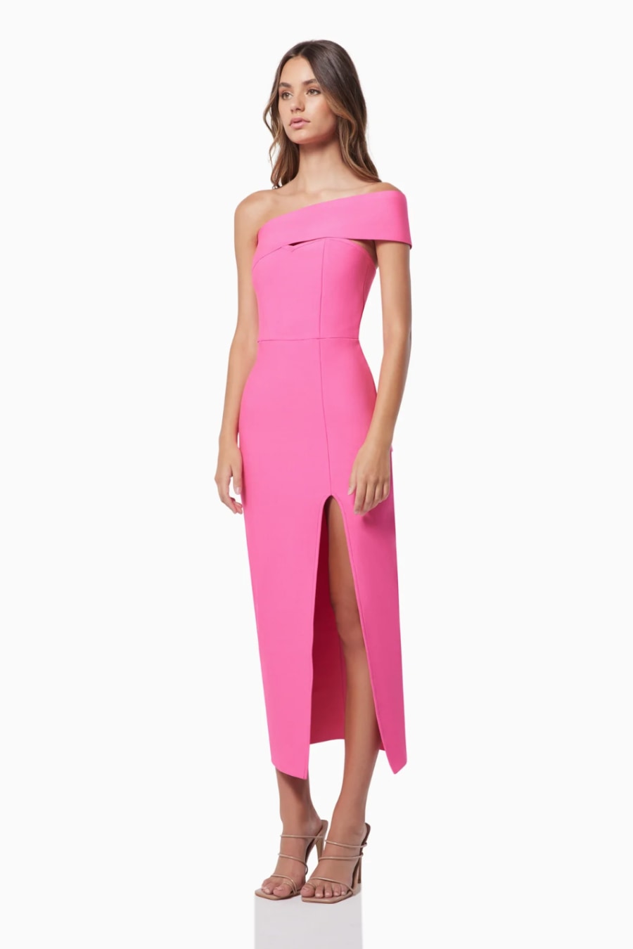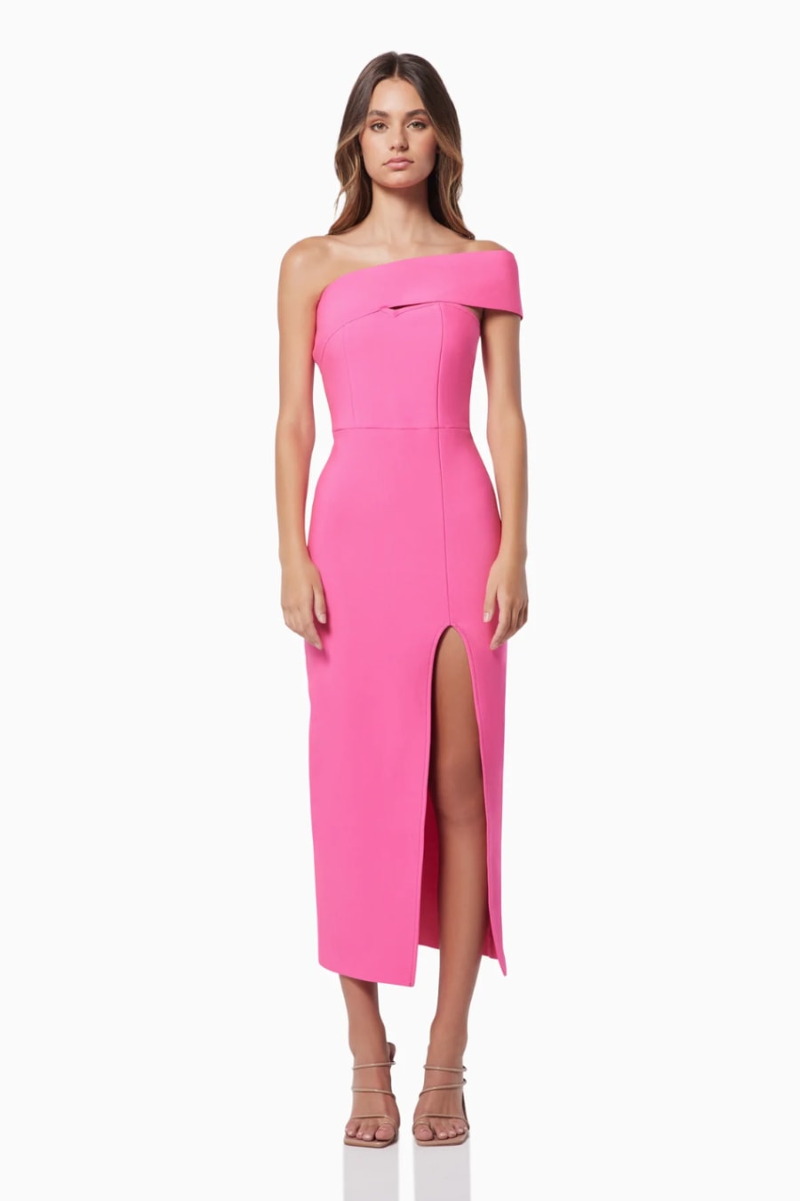 The Soroa Dress is fitted in its form, the dress features an asymmetric one shoulder neckline, thigh high split and body contouring seams.