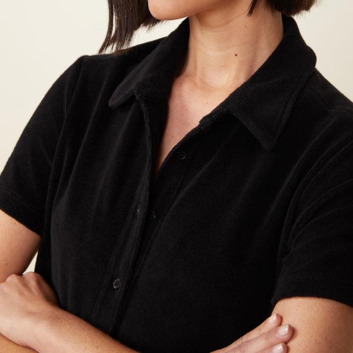 Terry Cloth Shirt Dress. 85% Cotton, 15% Polyester.