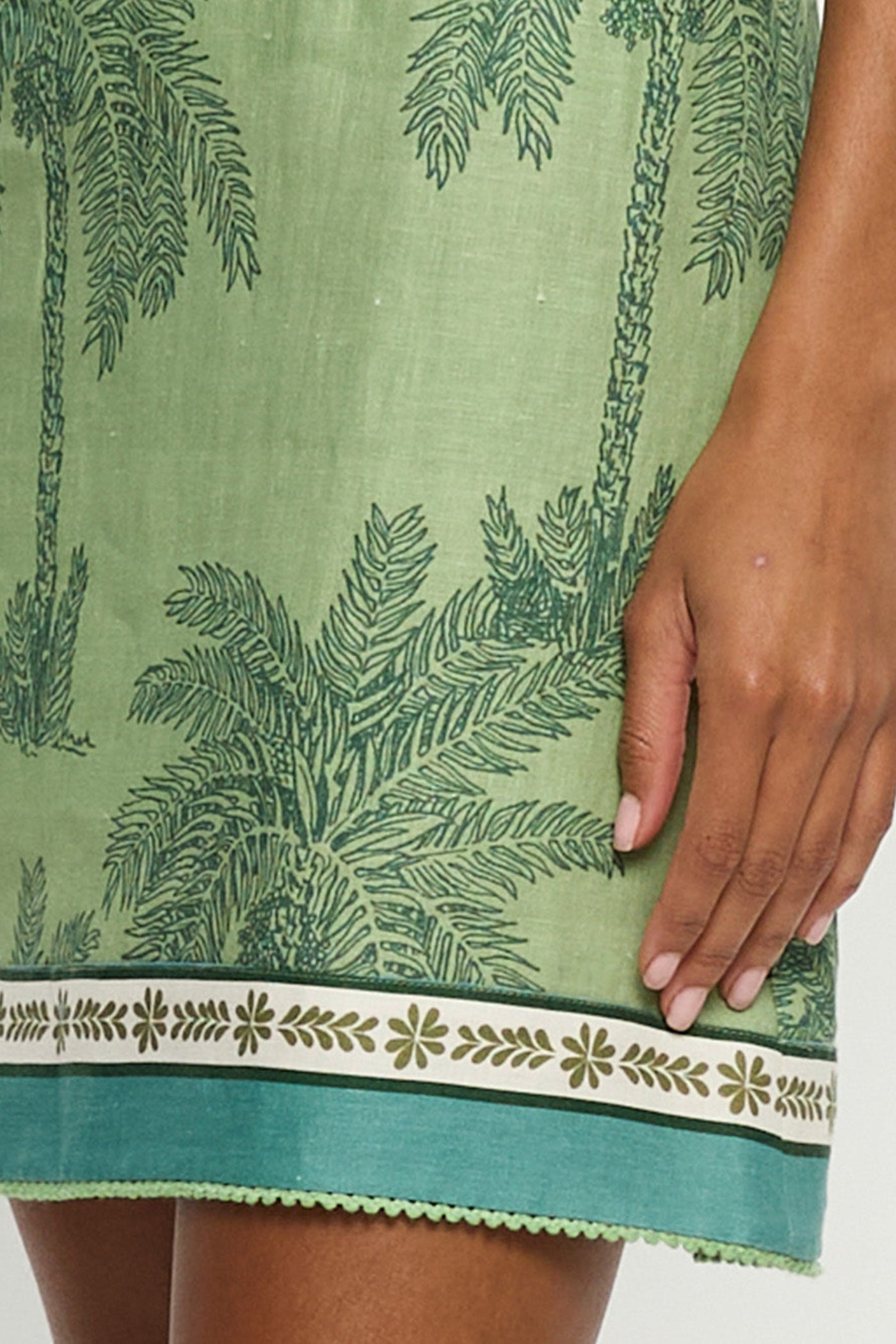 The Alani Mini Dress is a relaxed silhouette featuring a boat neckline trimmed with lace, a keyhole detail at the back, and a contrast border along the hem. A timeless style designed for warm, effortless days.