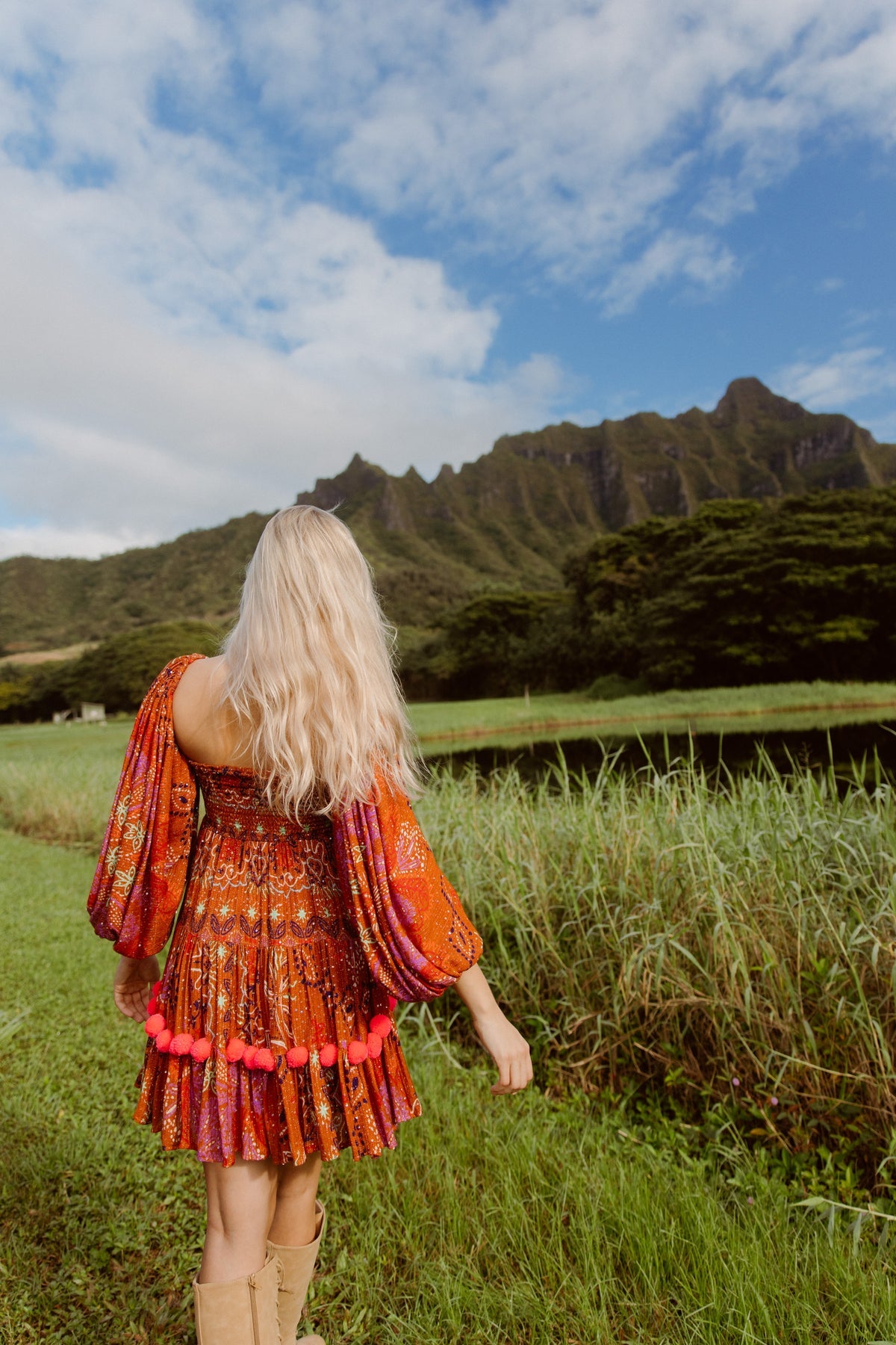 Embellished by sequins lines and shiny yarns, Alessia dress has a smocked top and a flared bottom. Flared sleeves are tightened by elastics and prettily decorate the piece. The bottom of this colorful dress has three gathered parts sublimed by colorful pompons that highlight the details.