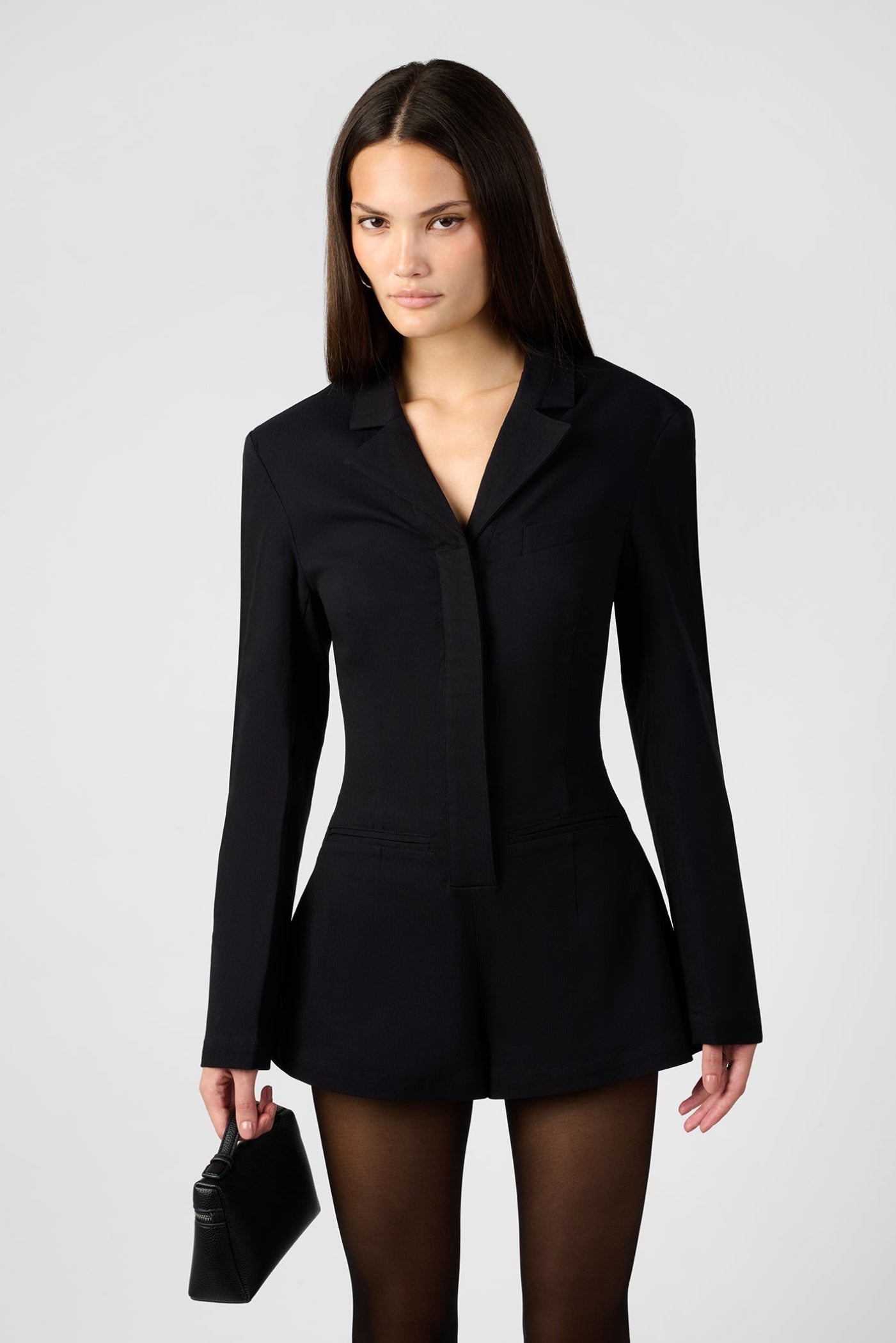 This blazer-romper is designed in our suiting fabric, structured with shoulder pads and a cinched fitted waist. It’s detailed with tailored faux pockets and a concealed button-down placket.