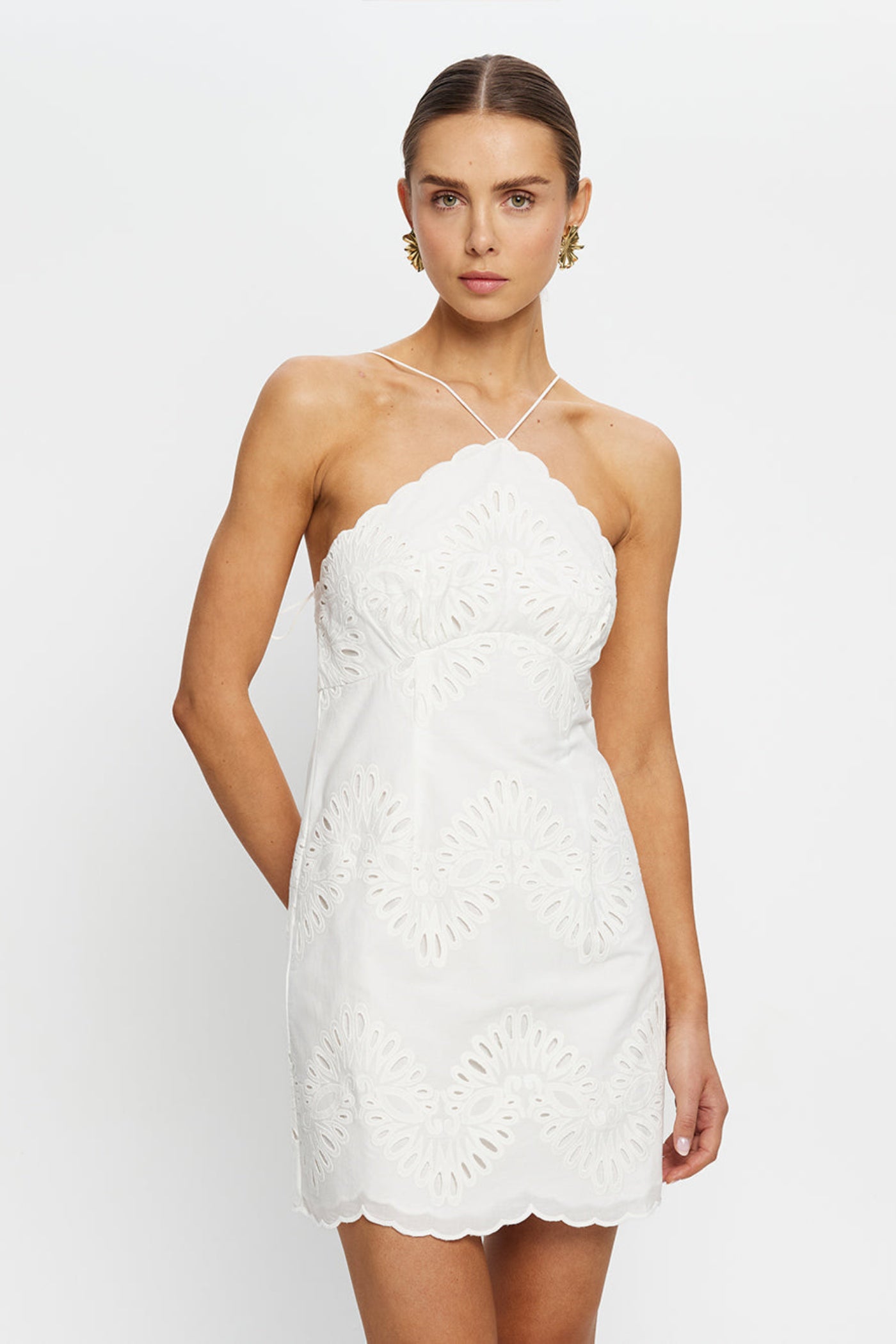 The Danielle Mini Dress is crafted from white cotton broderie, featuring a halter neckline with adjustable ties and a softly fitted bodice. Scalloped edging frames the neckline and hem, adding a considered finish to this light, easy silhouette. Style with sandals for sun-filled weekends and daytime outings, or elevate with heels for seasonal celebrations and long lunches.