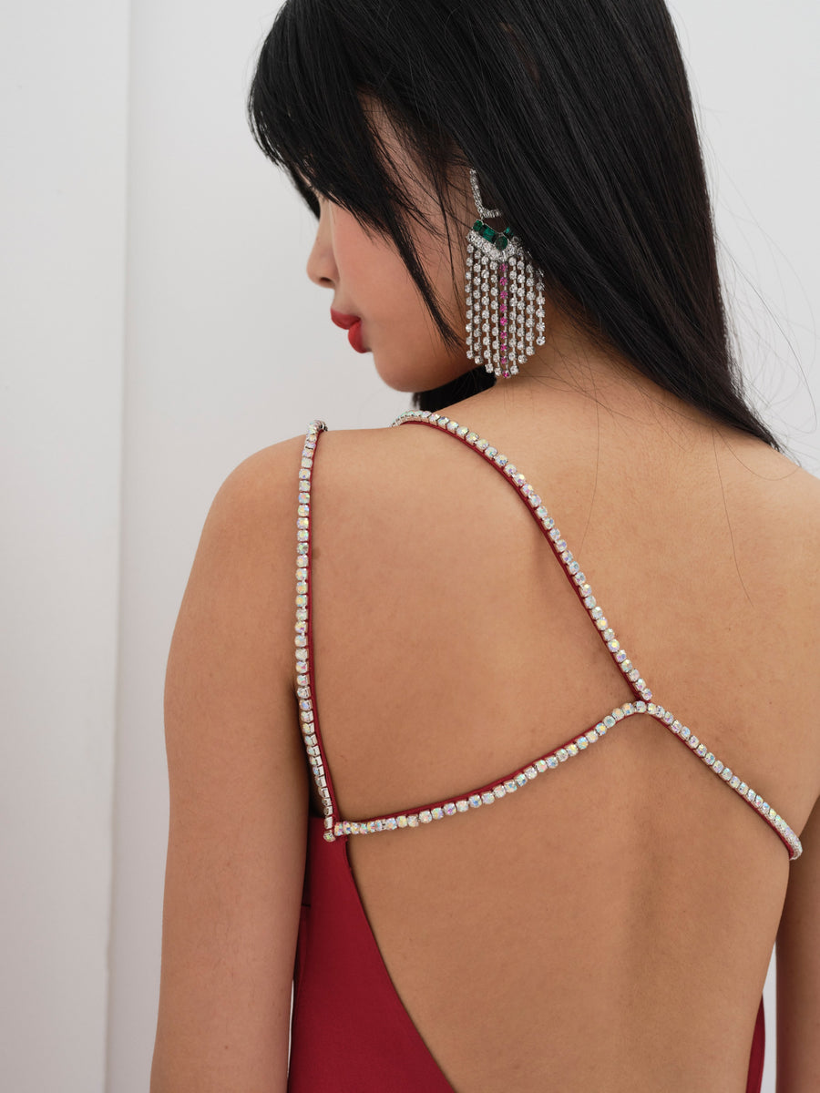 53% ecovero, 47% viscose. Drapey viscose ecovera fabric. One-shoulder strap. Iridescent rhinestone straps. Thigh-high slit. Plunging open back. Invisible zip closure.