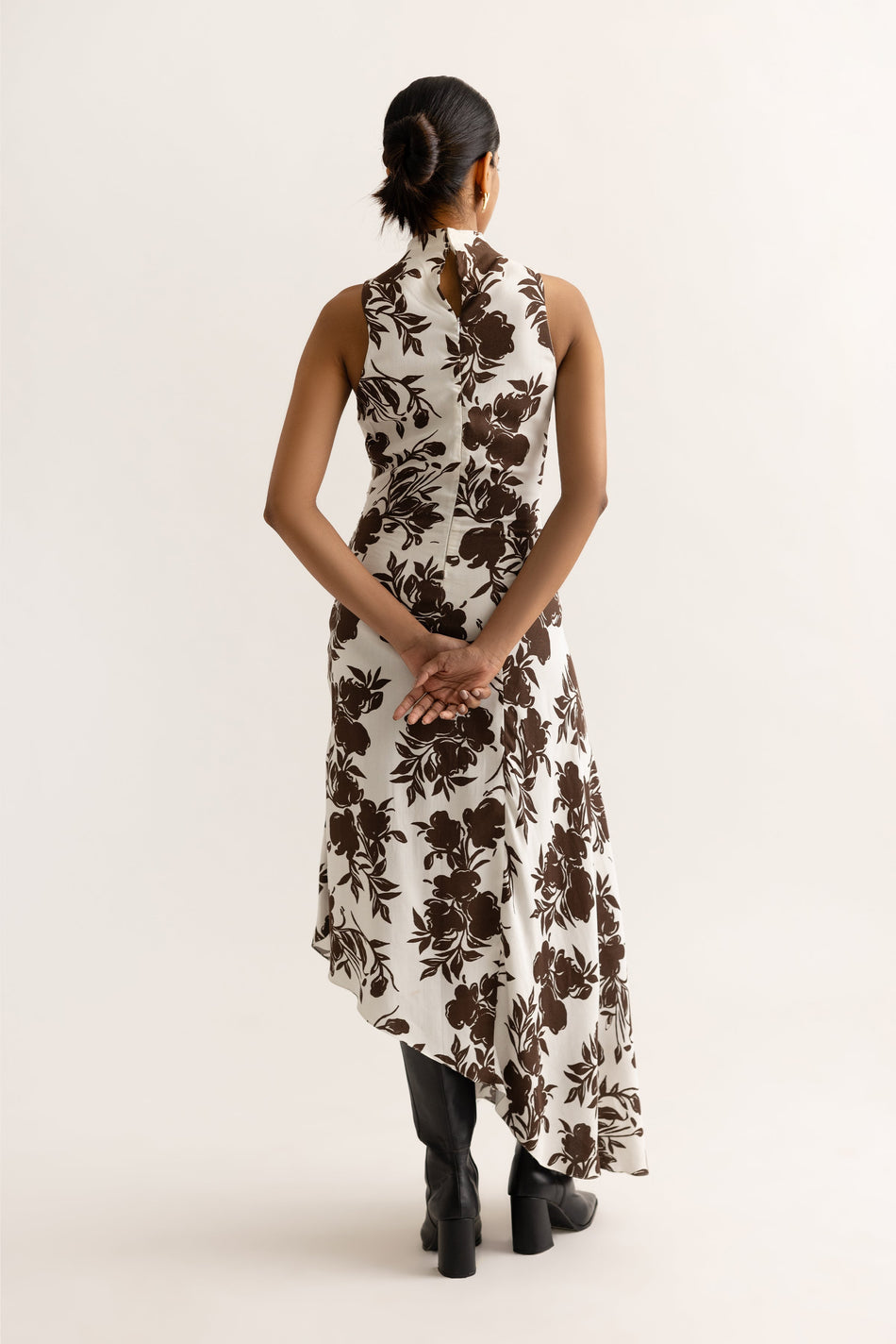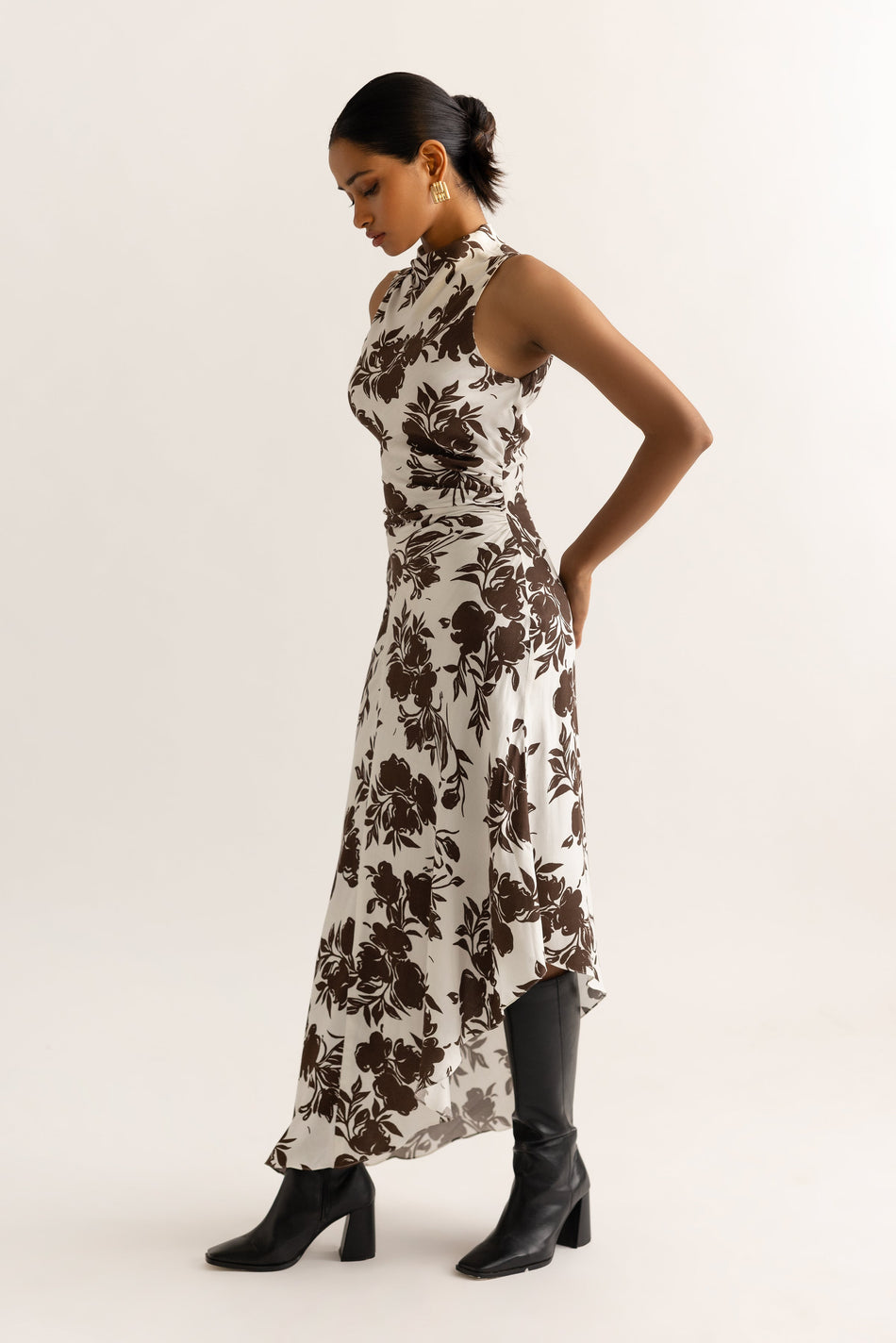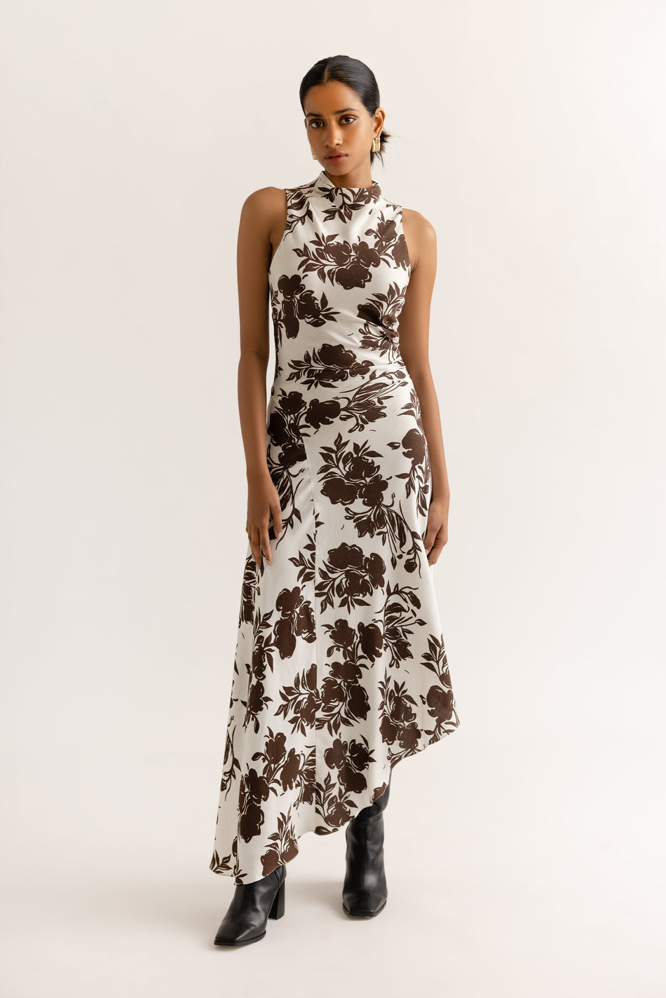 Effortlessly femme, this flattering maxi is featured in a soft fabrication and eye-catching asymmetric silhouette with a chic cowl-neckline and ruched detail for added dimension.