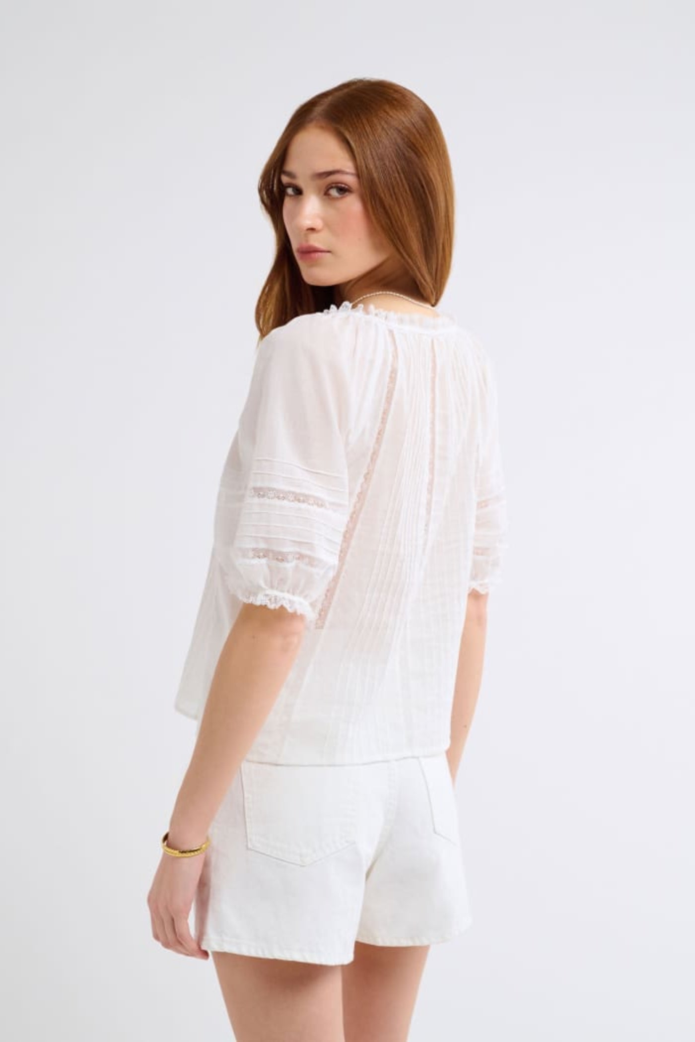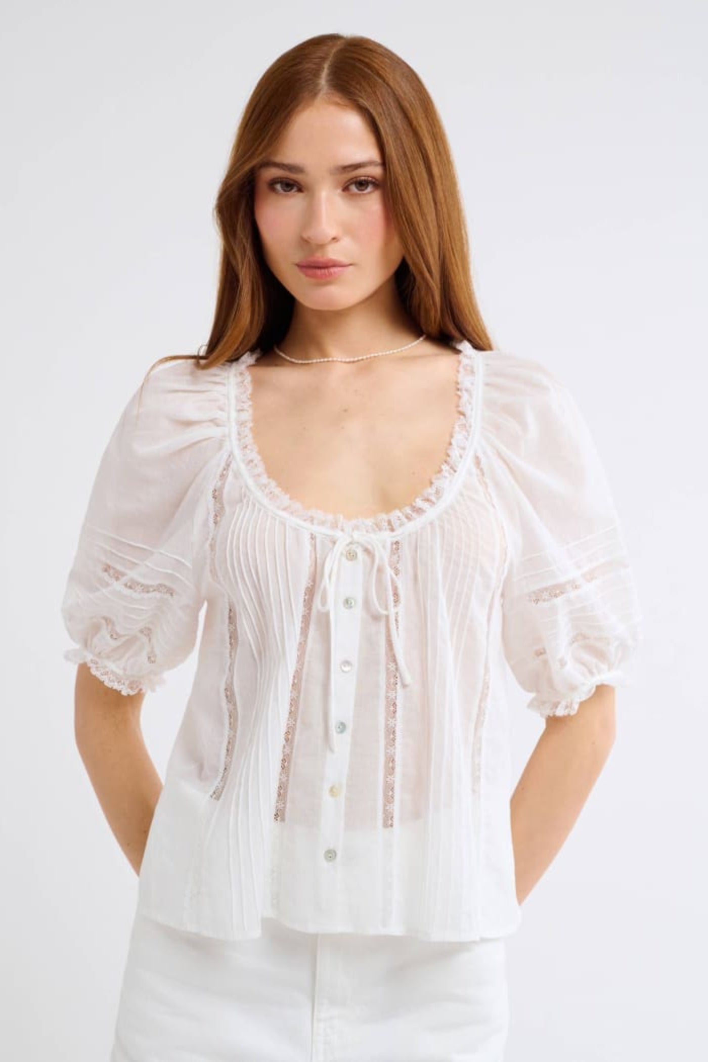 The Prairie Top is pure countryside charm—crafted from airy cotton voile with intricate inset lace, delicate micro pleats, and a dainty self-tie at the center. Light, romantic, and brimming with vintage-inspired sweetness.