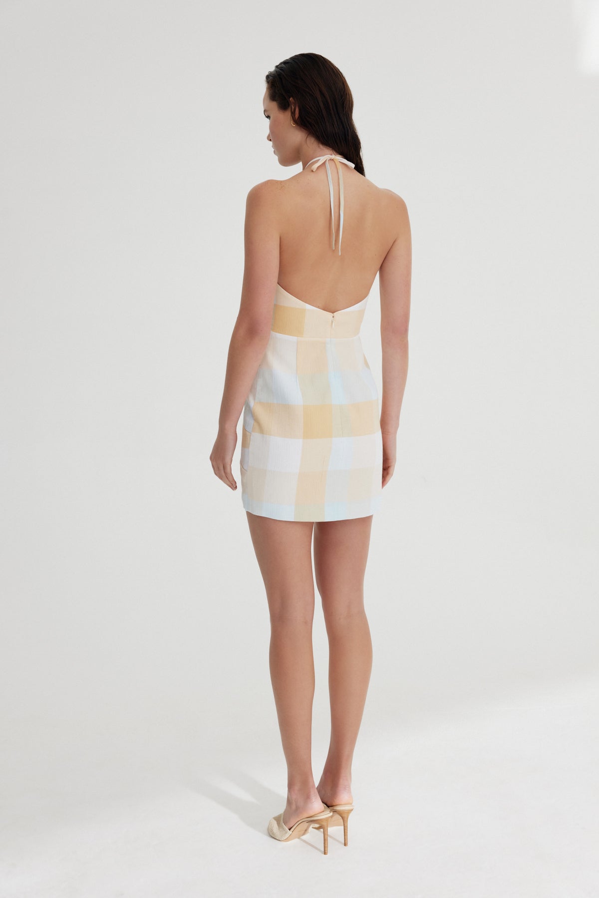The Stella Mini Dress features a halter neckline, front bodice cut out detail and cross over fabric detail from the waist toward the hem. Pair with a simple heel for an elevated finish.
