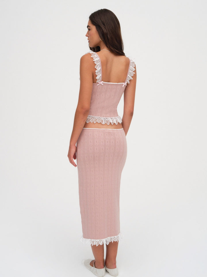 You'll be a flawless '90s muse in the Andy pink knitted crop top—a cropped tank top crafted in a pointelle knit, with a semi-heart shaped neckline and ruffled lace trims at the shoulder straps, underbust, and hem.