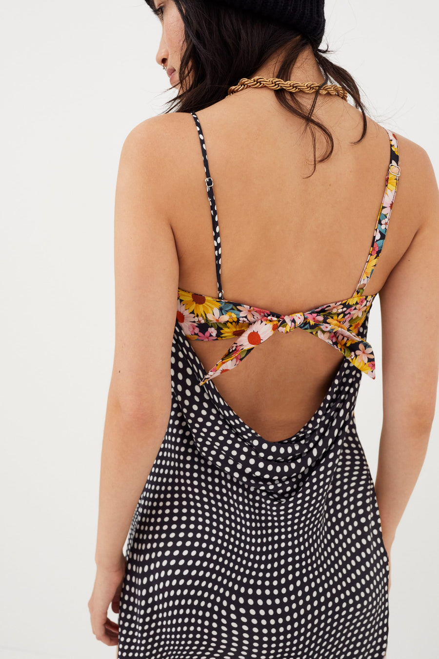 Self: 50% ecovero™, 50% viscose. Contrast: 50% ecovero™, 50% viscose. Mixed prints. Cross-over fabric. Underwire bra. Front slit. Adjustable straps. Self tie back detail.