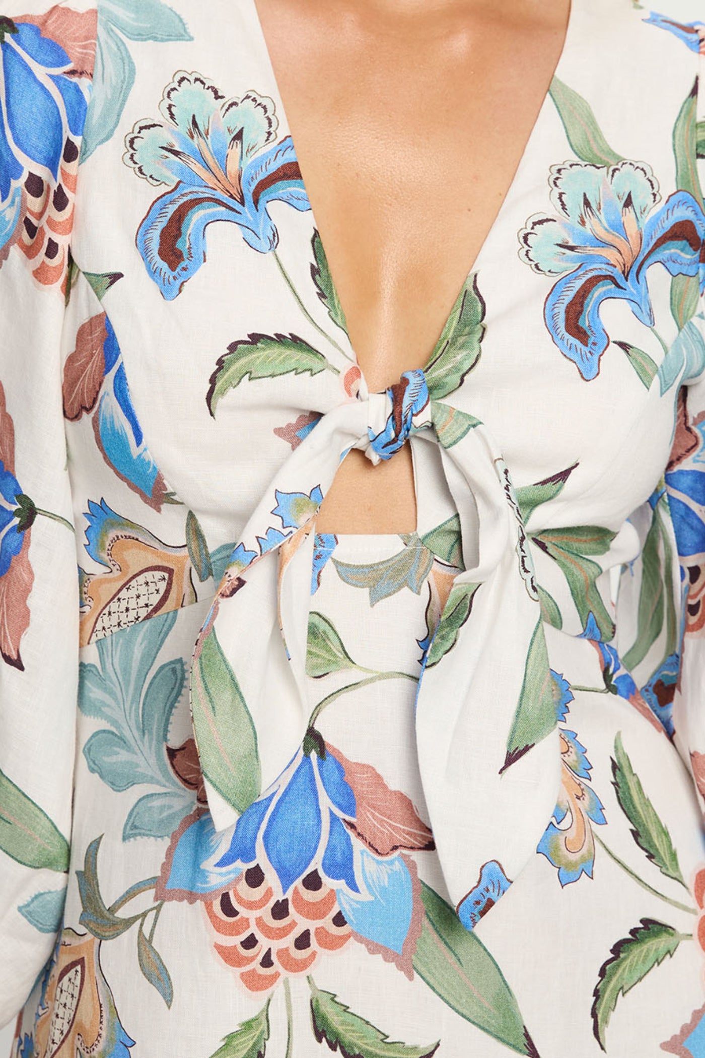 Azure is a bold floral, alive with striking blue blooms, terracotta accents and green leaves on a crisp white base. The Azure Mini Dress is defined by a v-neckline, tie-front bodice and long sleeves, finished with contrast mint detailing that frames the print with subtle distinction. Style with heels for an elevated evening look, or wear with sandals for effortless daywear.