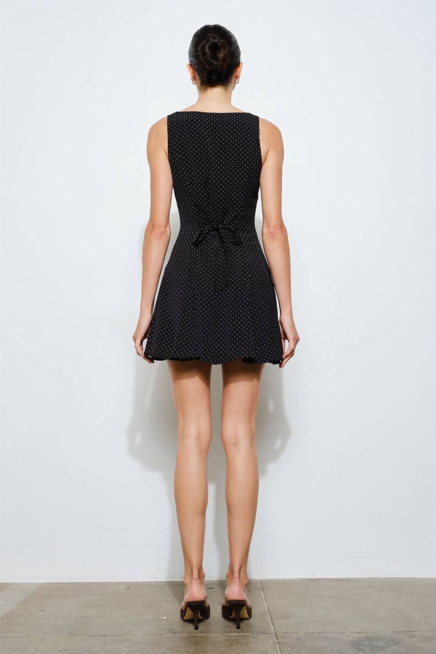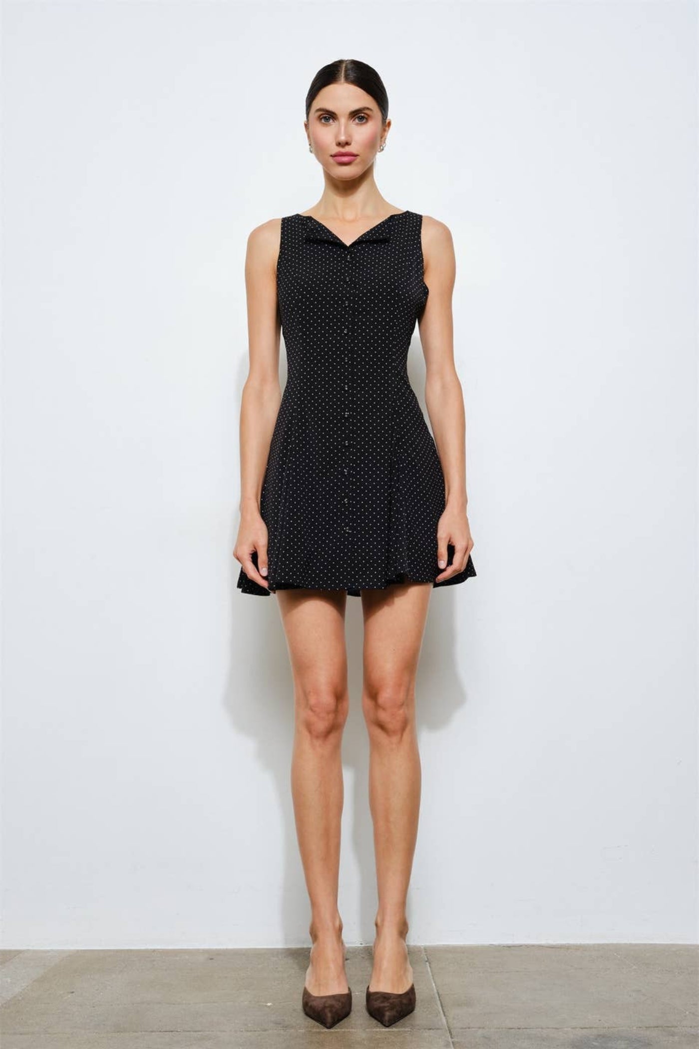 The Beatrix dress exudes vintage charm with its classic polka dot print and flattering fit-and-flare silhouette. It features a front button up closure that frames the neckline and a tie-back detail to create a perfectly cinched waist. This sleeveless mini is a timeless choice for any daytime occasion.