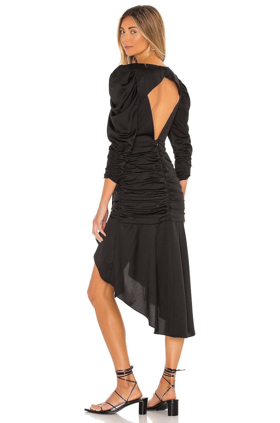 Self: 100% recycled polyester. Lining: 97% polyester, 3% spandex. Puffed shoulders. Ruched fabric throughout. Hidden back zipper closure.