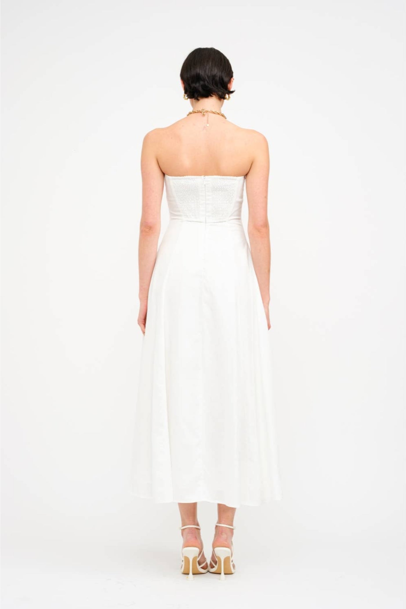 This strapless midi dress crafted from a linen-blend fabric features a back zipper closure for a tailored fit.