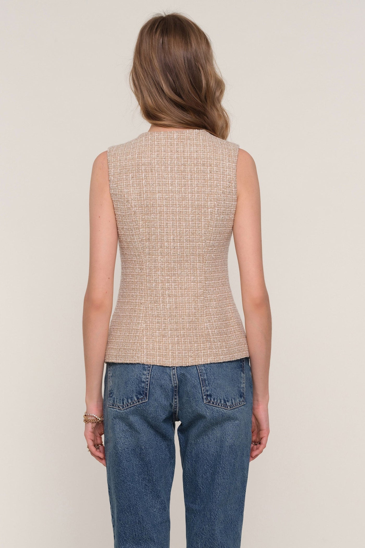 The Chase Vest has become a fan favorite. Made from a tonal, textured tweed, it features a crew neck, pinched waist and novelty buttons. Pairs perfectly with your favorite denim.