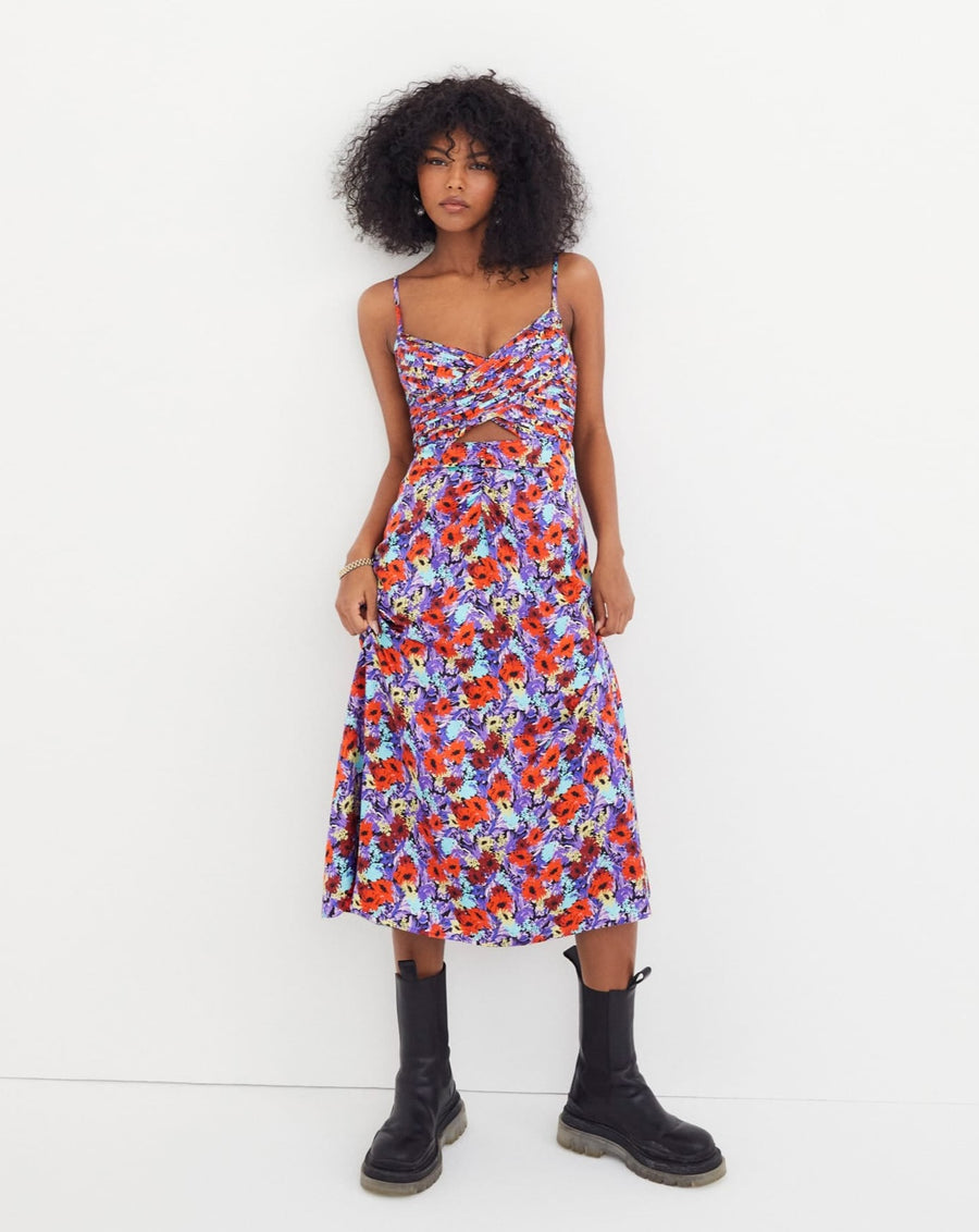 Self: 56% ecovero™, 44% viscose. Lining: 98% recycled polyester, 2% spandex. Degas floral print. Pin-tucked cross front details. Adjustable straps. Keyhole at lower back. Button closure. Center-back invisible zipper.