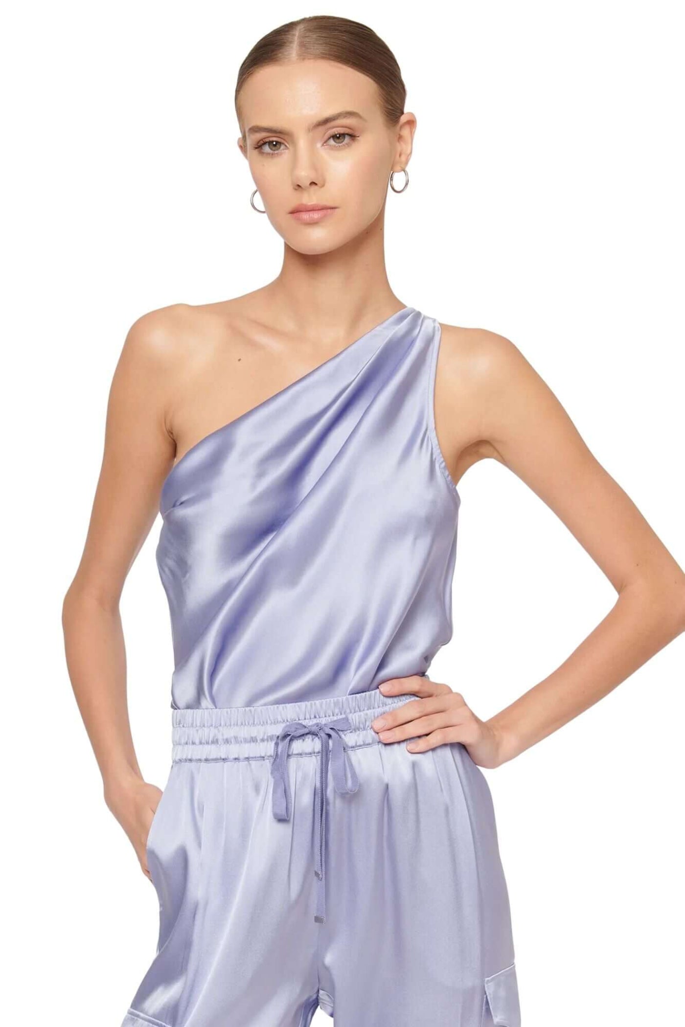 The Cami NYC Darby Bodysuit in Cornflower. Constructed with silk stretch sandwash charmeuse, the Darby Bodysuit is a comfortable and effortless fit. The asymmetrical draped neckline adds a sophisticated touch to a one-shoulder style.