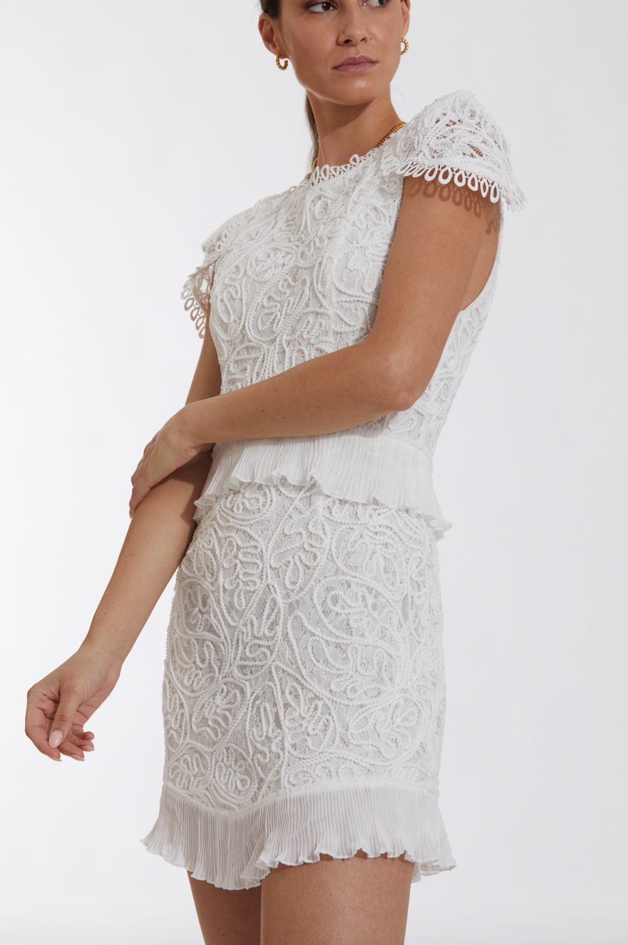 Cornelli lace. High neckline. Cap sleeves. Plisse waistline and hemline. Invisible rear zip fastening. Picot lace trims.