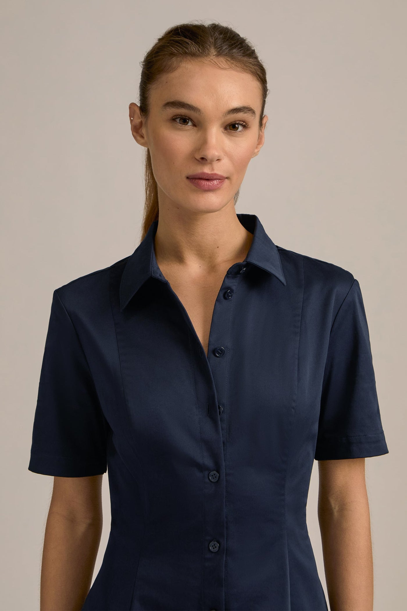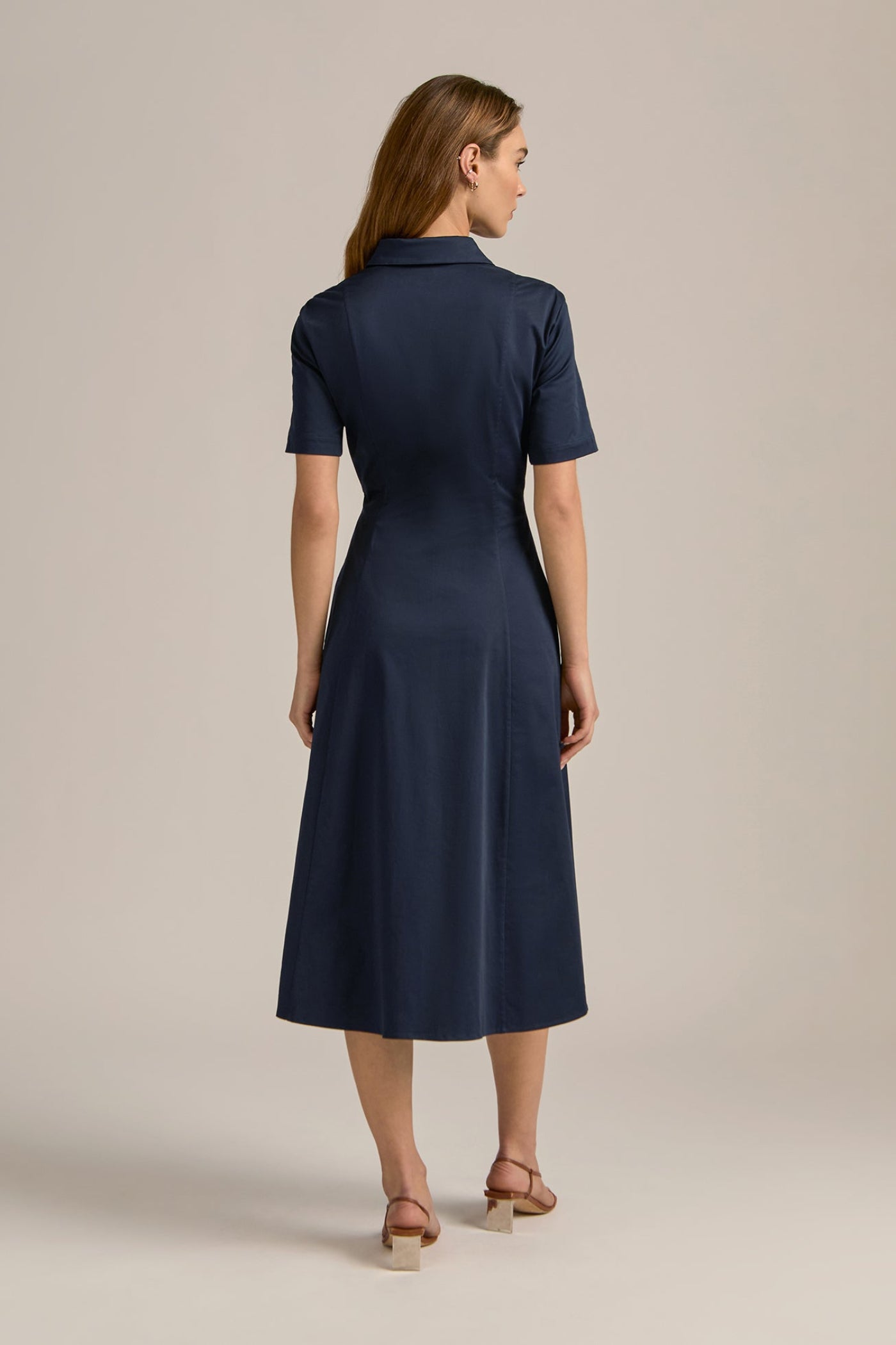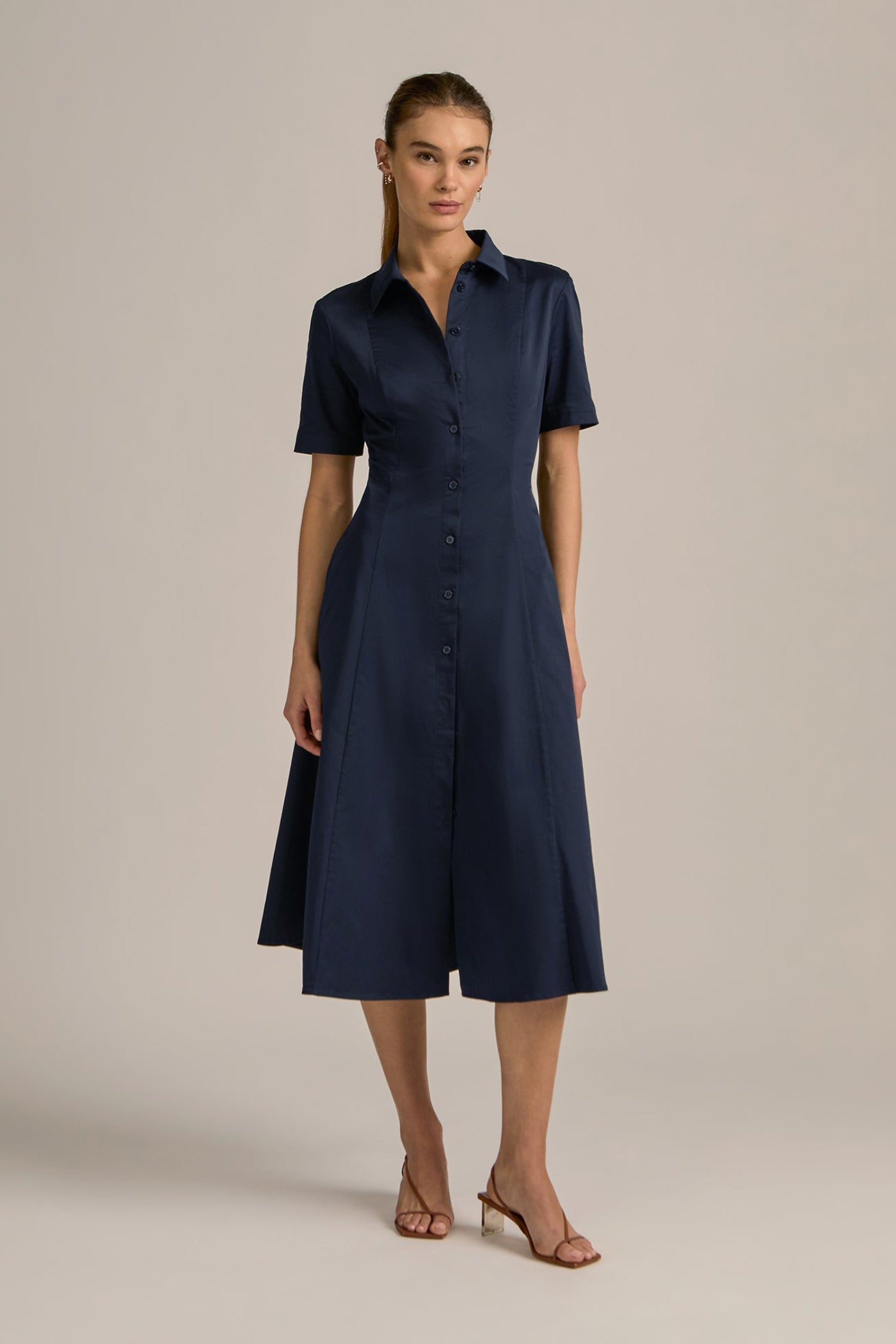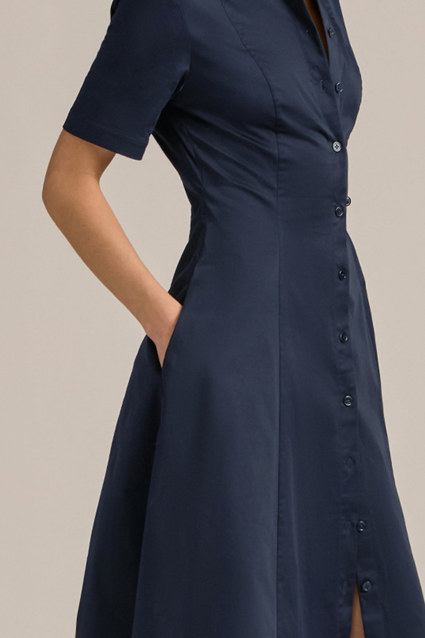 Very demure, very much a favorite. With button-up shirt styling, a fitted bodice, and full skirt, our new short-sleeve cotton poplin midi dress keeps it classy without even trying.