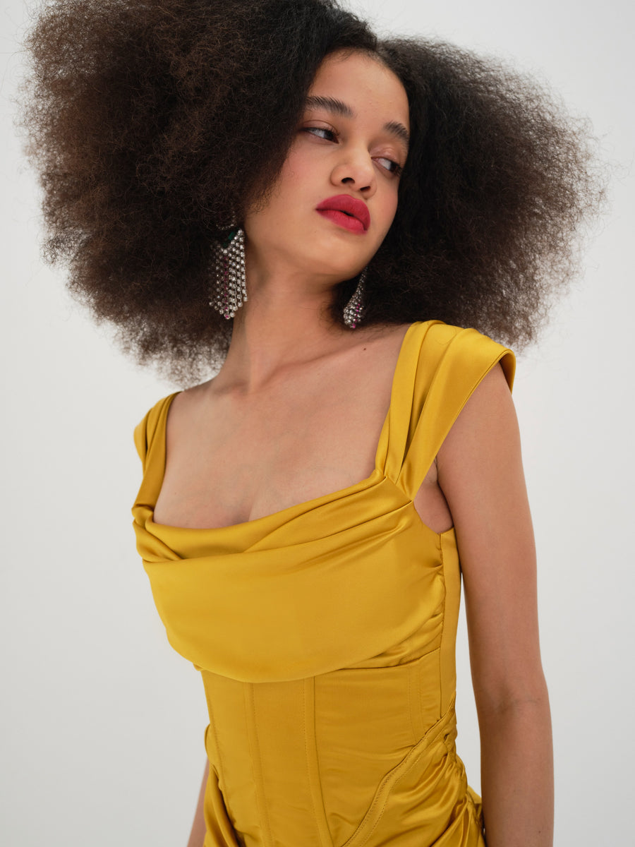 Self: 100% recycled polyester. Lining: 98% recycled polyester, 2% spandex. Satin strapless mini dress. Cowl neckline. Draped sleeves. Corset detailing along bodice. Asymmetrical gathered skirt. Keyhole at back waist. Hook & eye closure. Invisible zipper.