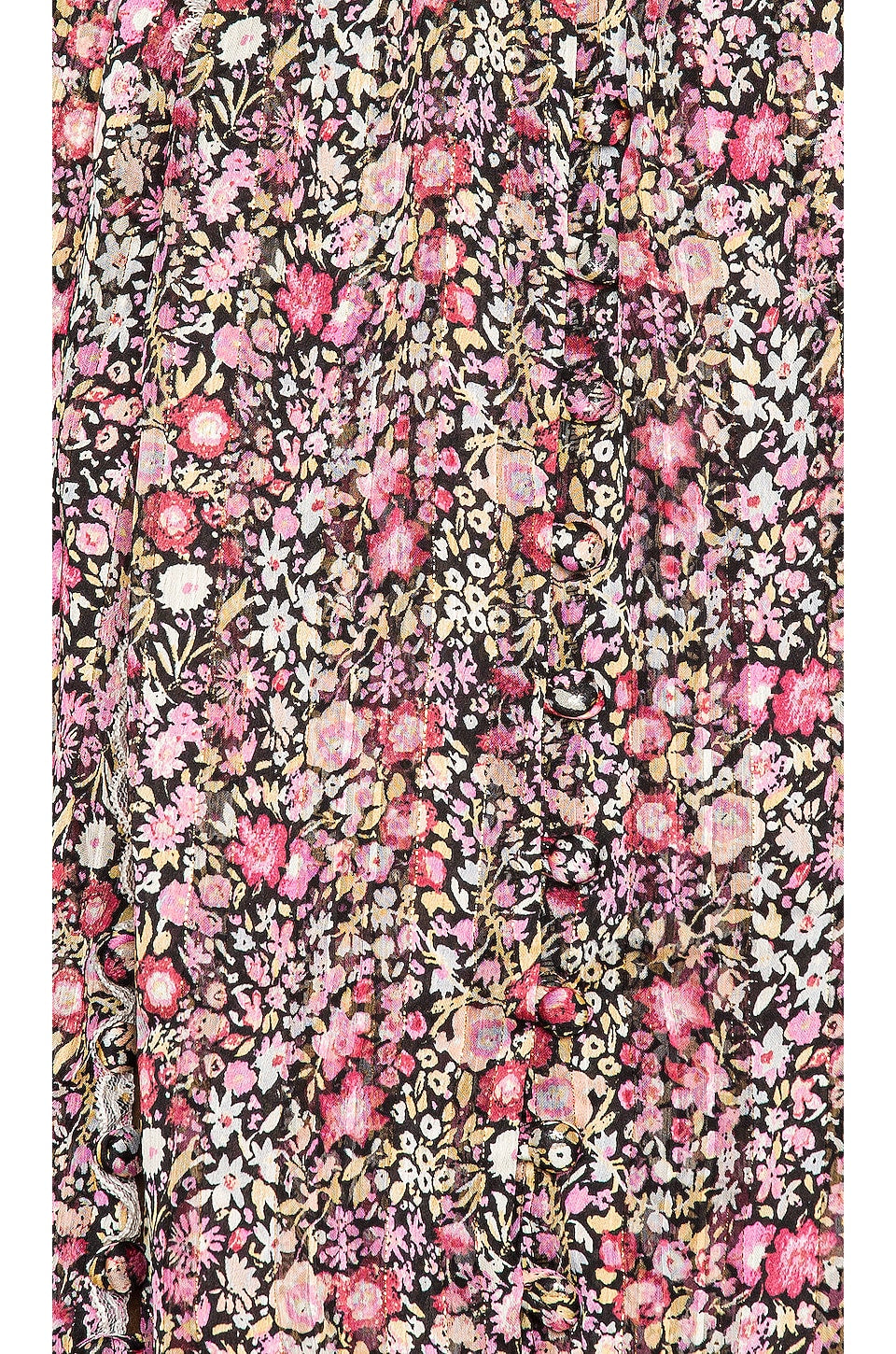 100% recycled polyester. Lurex threading details. Fully lined. Front loop button closure. Tie accents at neckline. Ruffle elastic cuffs. Smocked elastic waistband. Lace trim throughout.