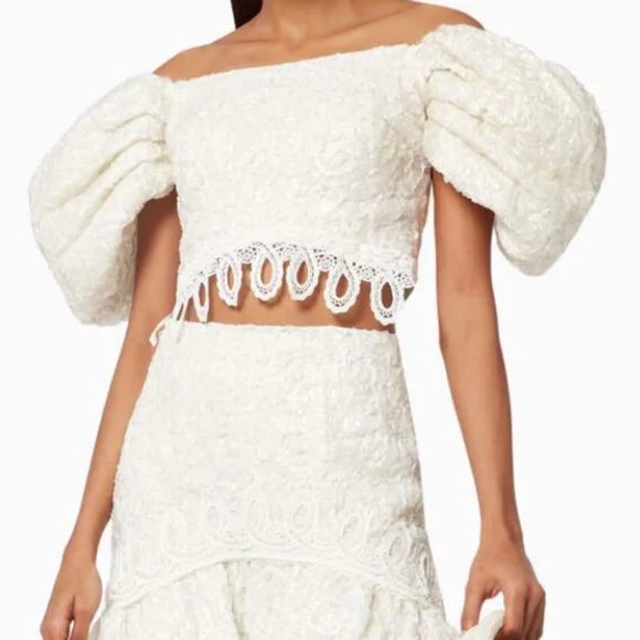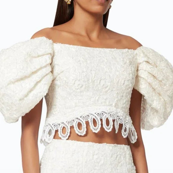 Cut from decadent lace, the Gracie Top features an off-shoulder top with puffy sleeves and embroidered hem.