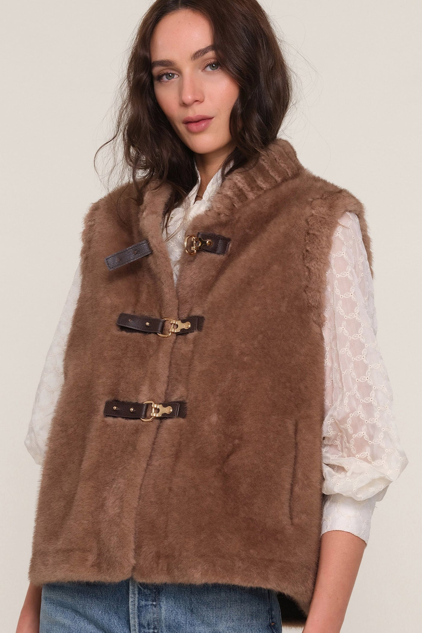 The Hosk Vest is made from a soft, faux fur. It has a relaxed fit, making it perfect to layer over your sweaters.