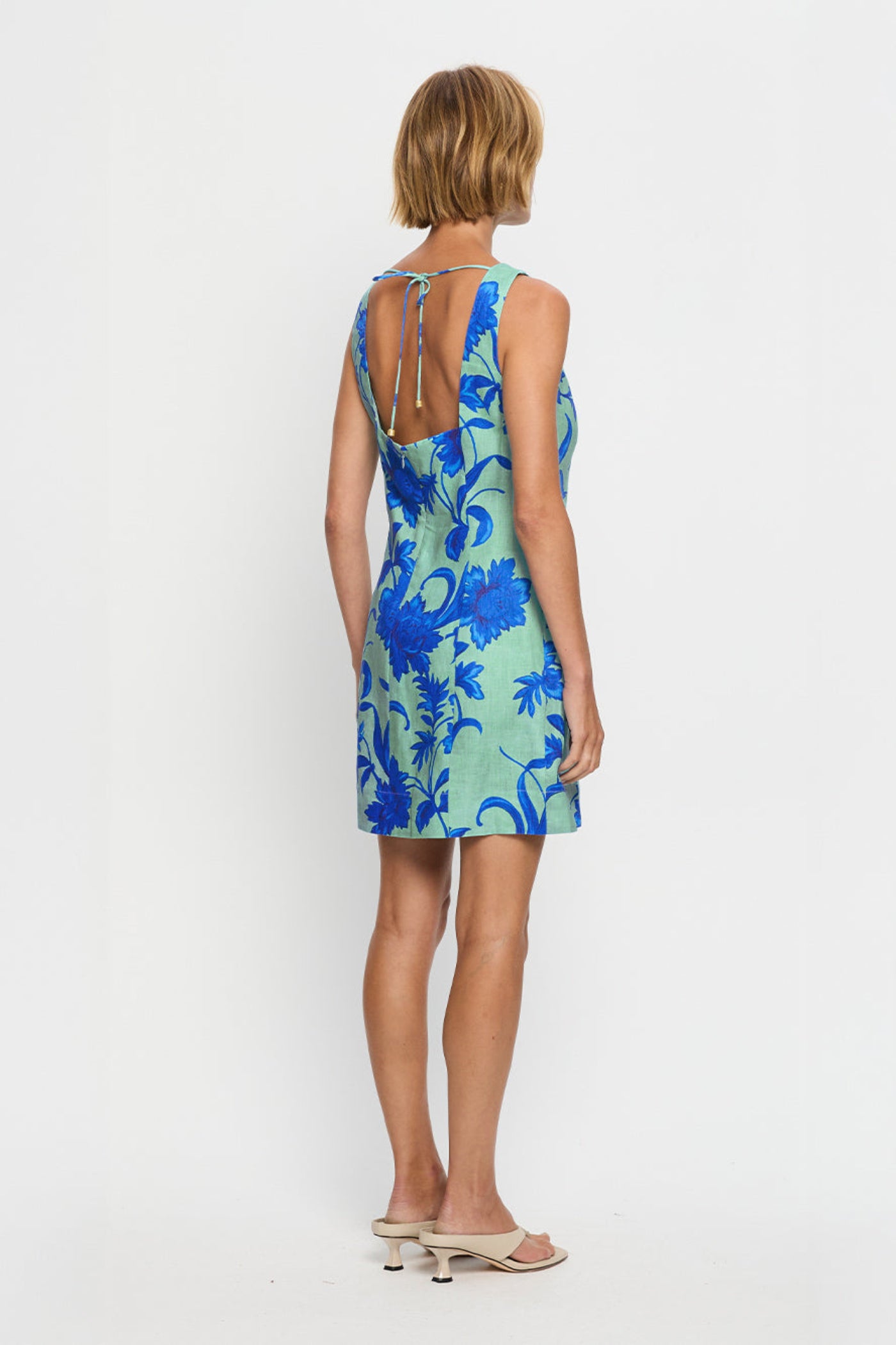 Juniper is bright blue florals set against a light teal base. The Juniper Mini Dress features a high boat neckline at front, a square back neckline and complete with ties at the back neck.