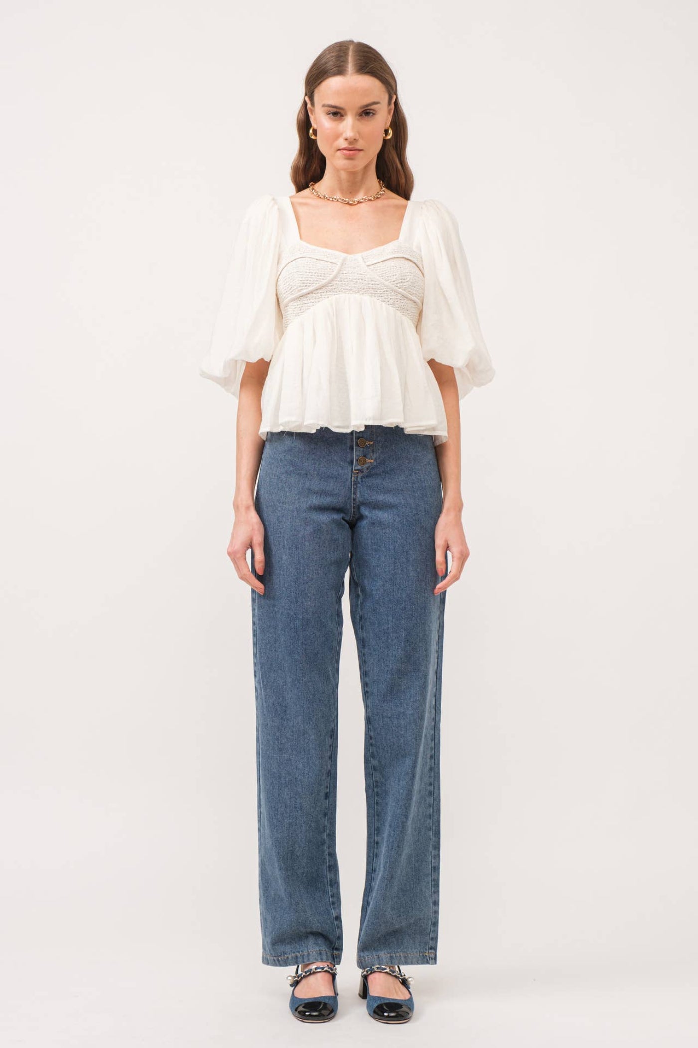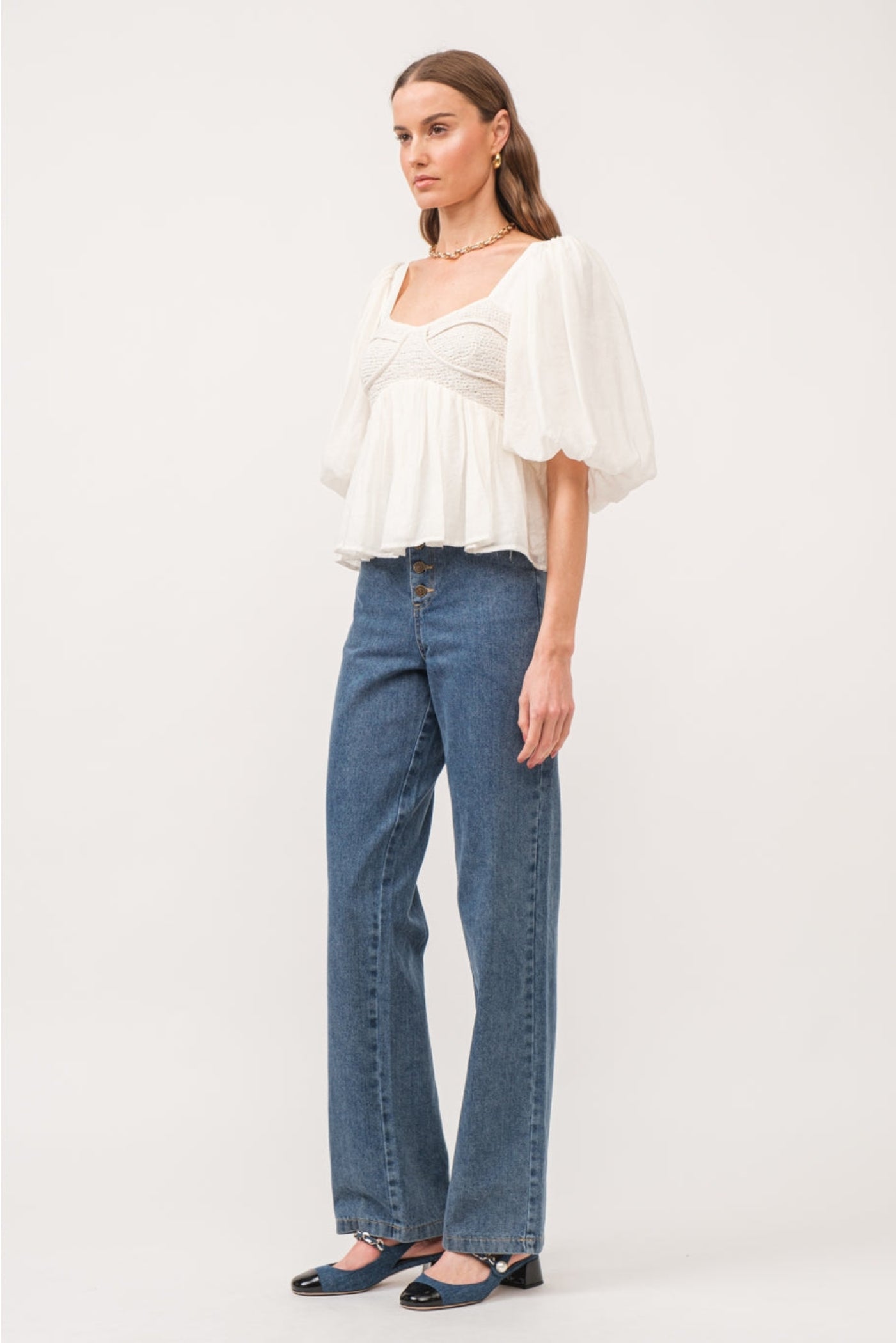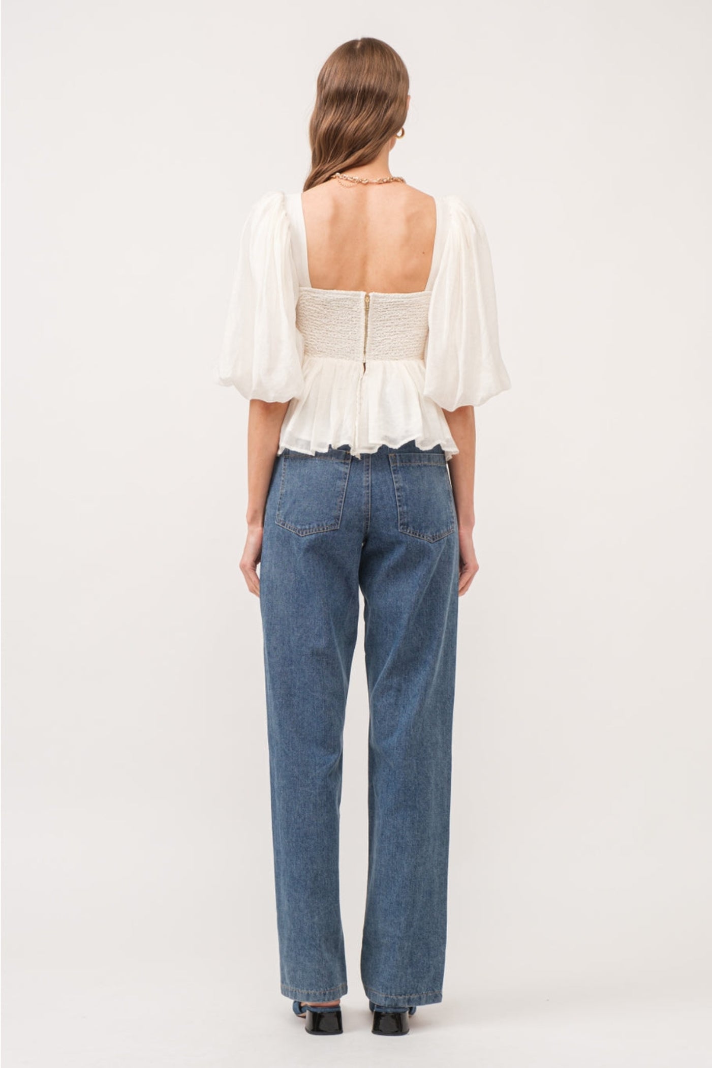 Blouse with smocked detailing and voluminous puffed sleeves.