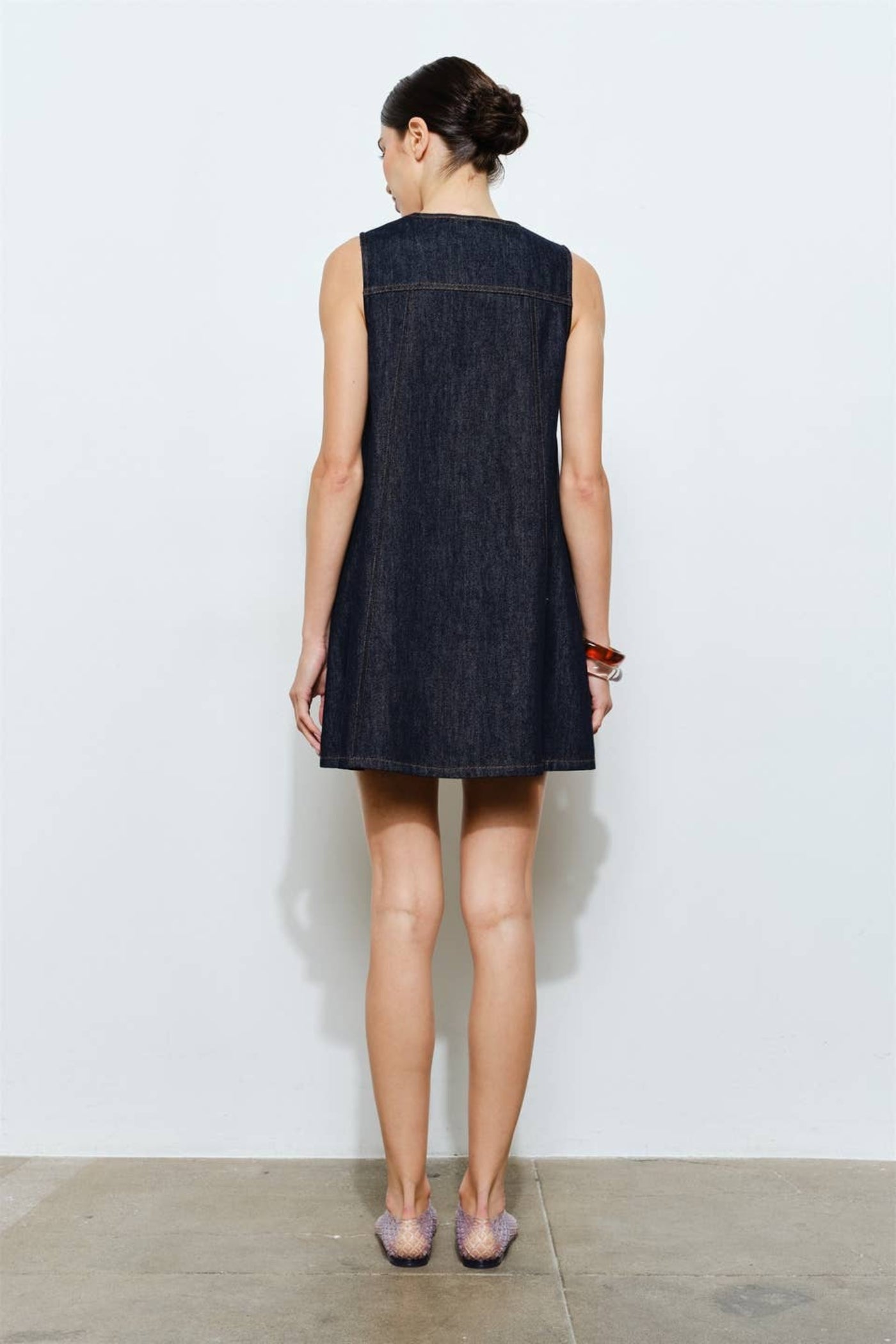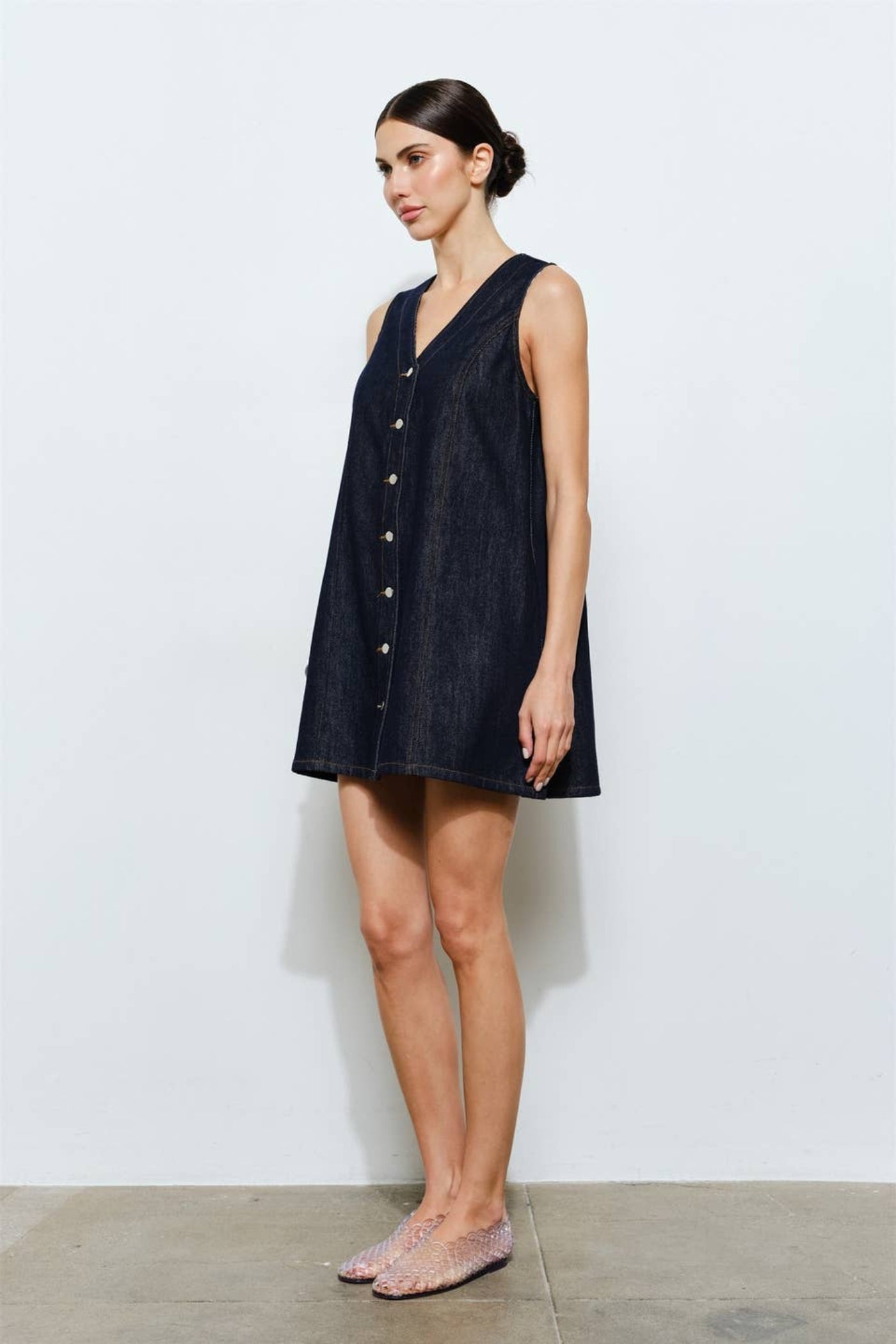 The Marigold Shift Dress introduces a streamlined, sleeveless silhouette with a mini A-line fit. A row of classic silver buttons down the front adds a polished accent to the design, offering a versatile look that transitions effortlessly from casual days to stylish evenings.