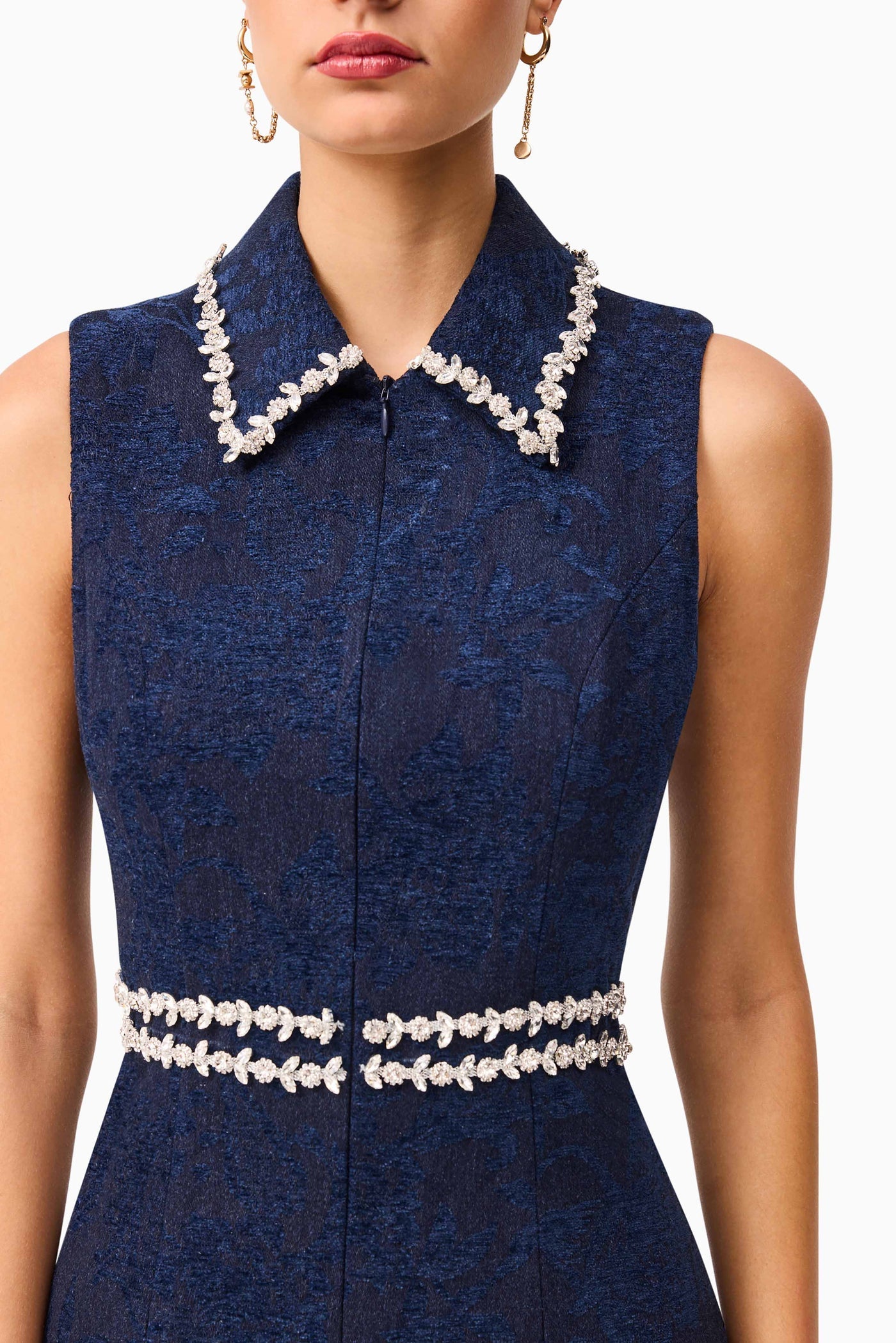 The Melody Mini Dress blends tailored structure with statement detailing. Designed in a premium denim jacquard fabrication, this slim-fitting silhouette is elevated by a collared neckline and a striking diamanté trim that catches the light with every move.