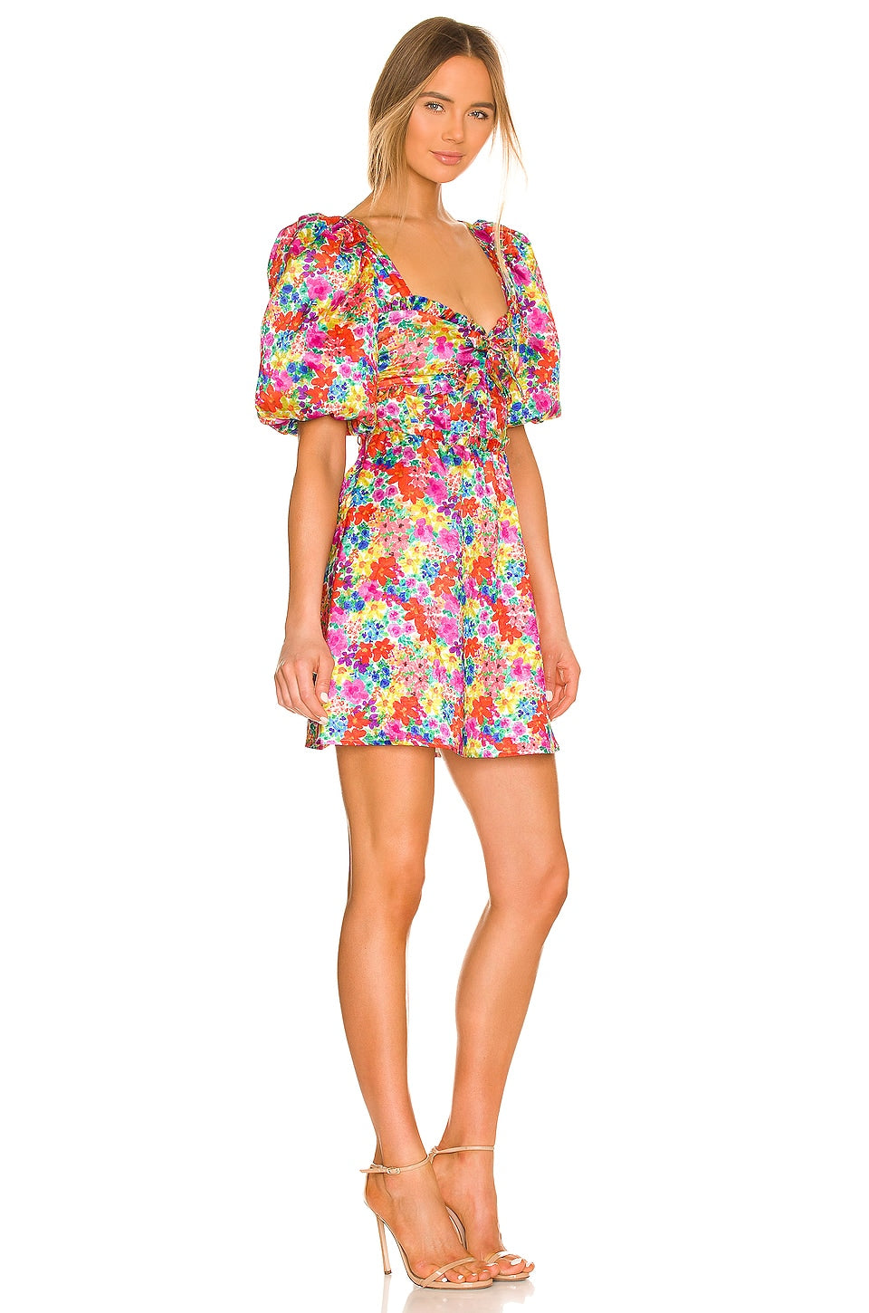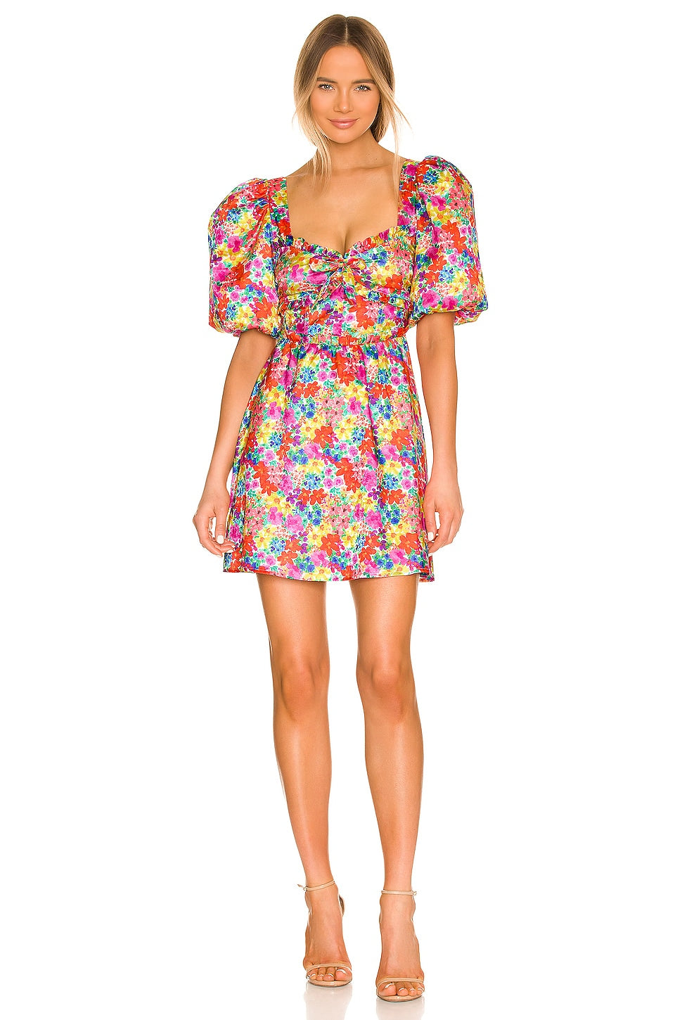 Poly blend. Satin jacquard fabric. Ruffle trim and neckline bow tie detail at bust. Boned bodice with ruffle waist trim. Elastic back strap with hook and eye closure. Lace-up back tie and hidden back zipper closure.