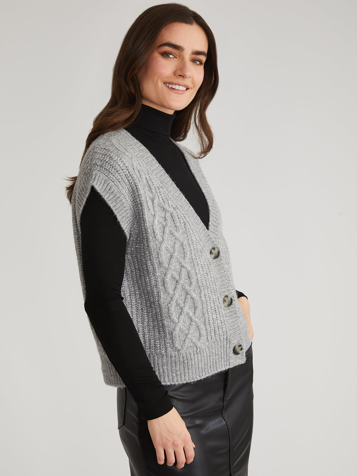 The Paige Cable Vest combines style and functionality with its sleek design and sturdy cable sweater material. The convenient button front adds a touch of sophistication, making it perfect for any occasion.