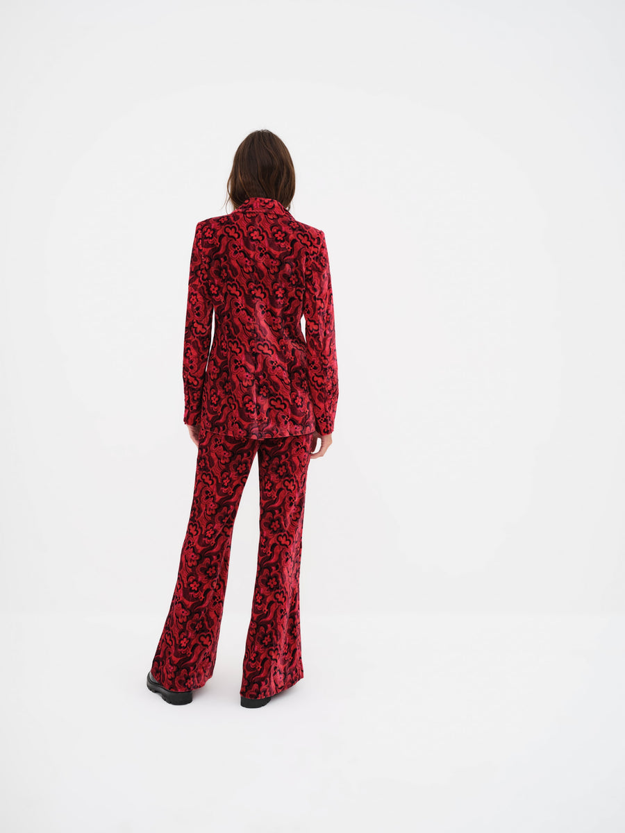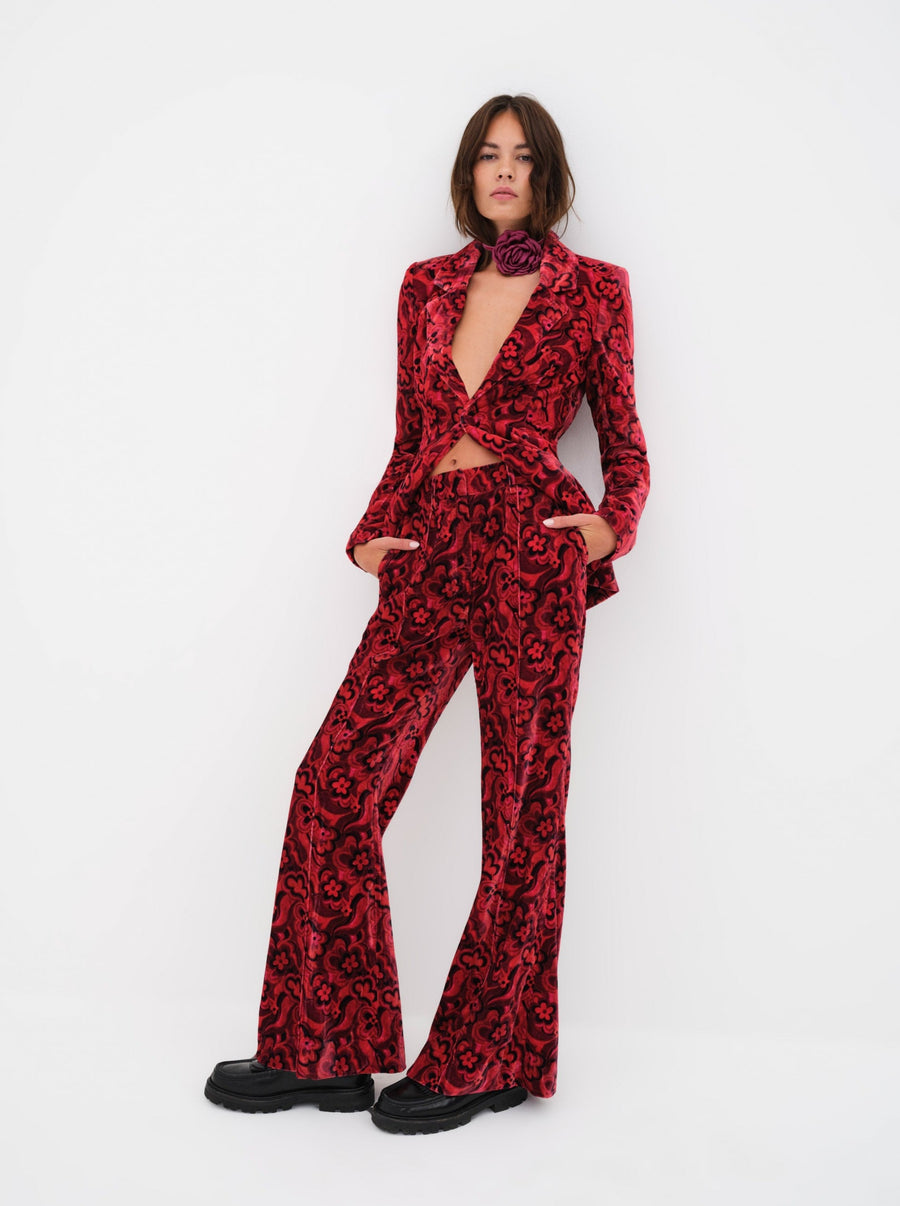 Self: 100% polyester. Contrast: 98% recycled polyester, 2% spandex. Psychedelic floral print. Velvet fabric. Wide-leg pant. Zip front. Hook & bar closure. Functional pockets.