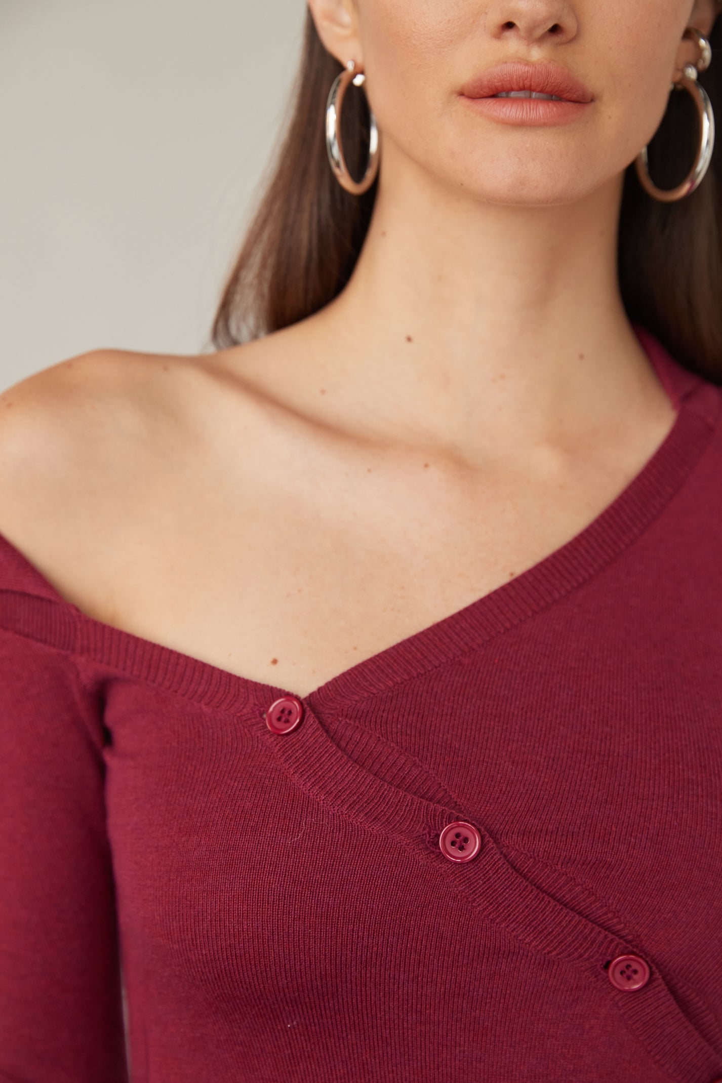 Long sleeve maxi dress with asymmetric button closure. Featuring an off-the-shoulder neckline with an extended collar.