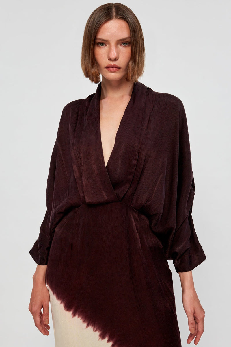 A signature silhouette with an effortless edge. A plunging neckline and relaxed, billowed sleeves bring soft drama, while gentle gathering at the waist enhances the shape. Rendered in Merlot Cloud with a striking dip-dye effect, this piece is made for after-dark elegance.