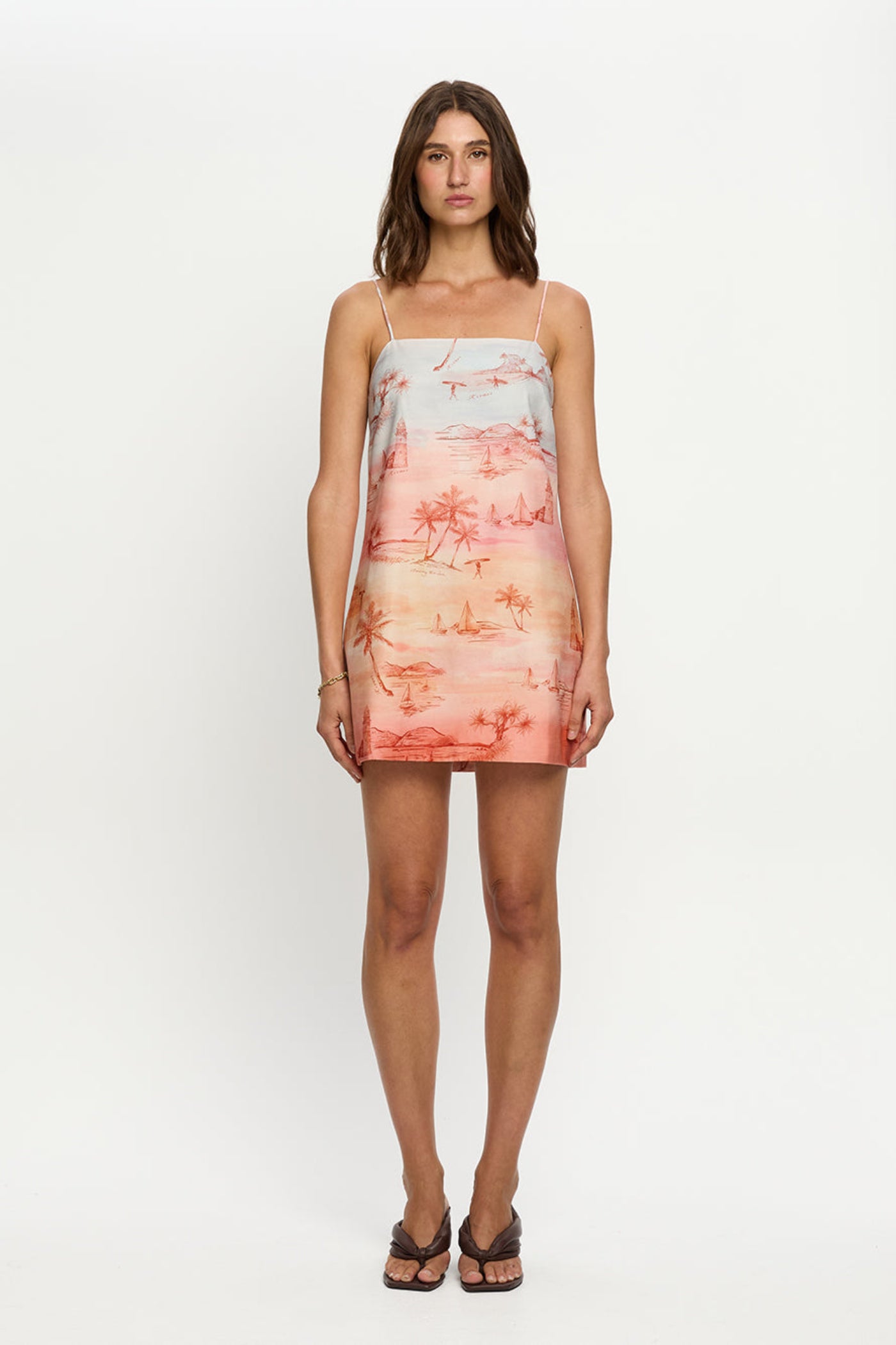 Sunset is a soft ombré wash of blush and sand tones with delicate coastal scenes - palm trees, sailboats and shoreline motifs - evoking a sun-faded, vintage seaside story. The Sunset Mini Dress features a straight neckline and fine straps that tie at the lower back. Pair with sandals for warm weekends style with heels for summer occasions.