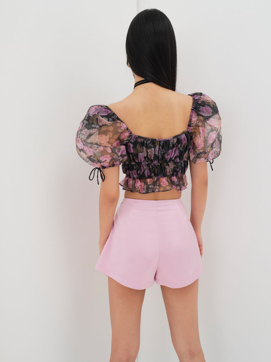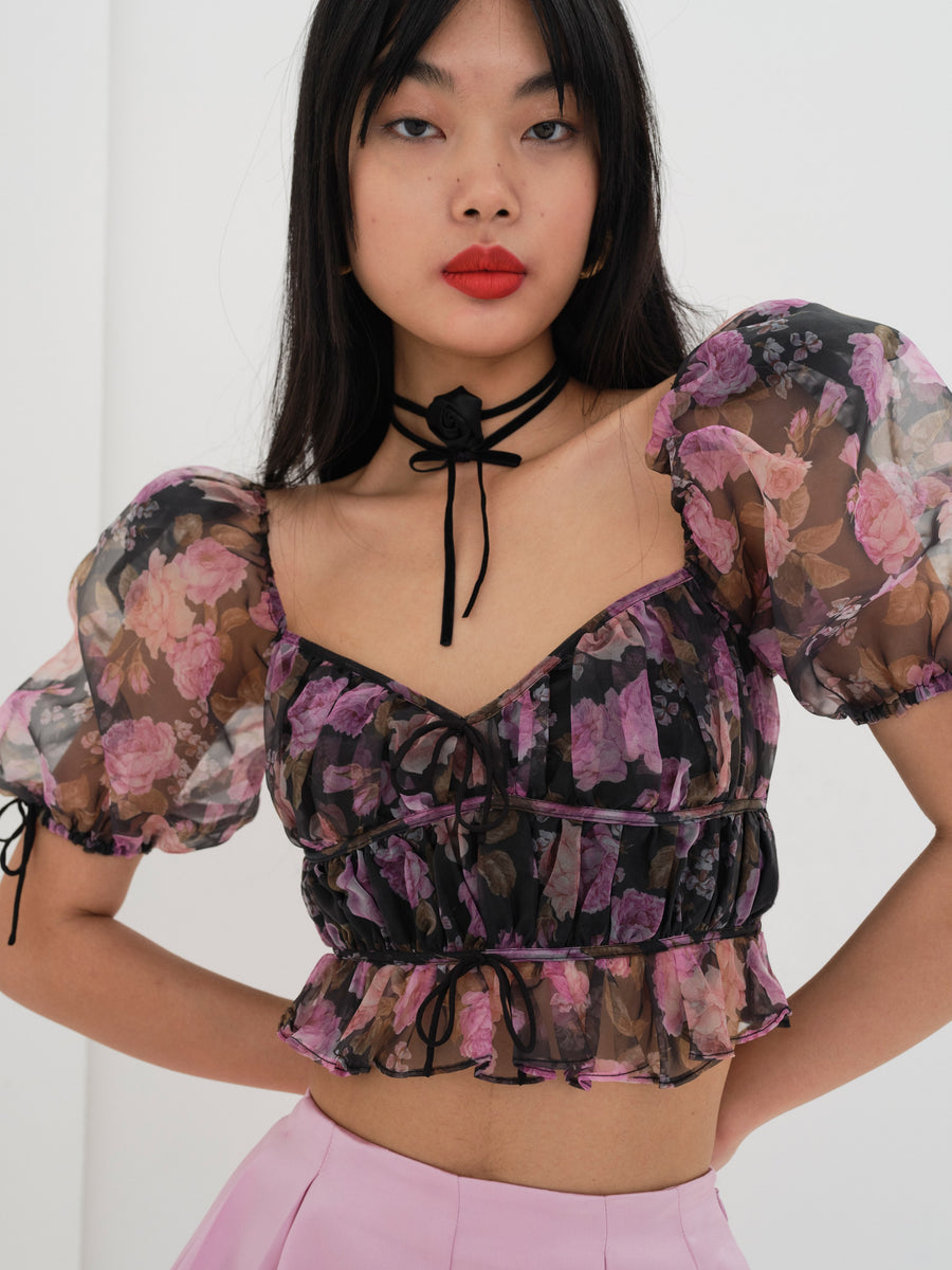 100% recycled polyester. Vintage floral print. Organza fabric. Sweetheart neckline. Shirred bodice. Skinny-tie bows throughout. Elasticized puff sleeve. Shirred shoulder pads.